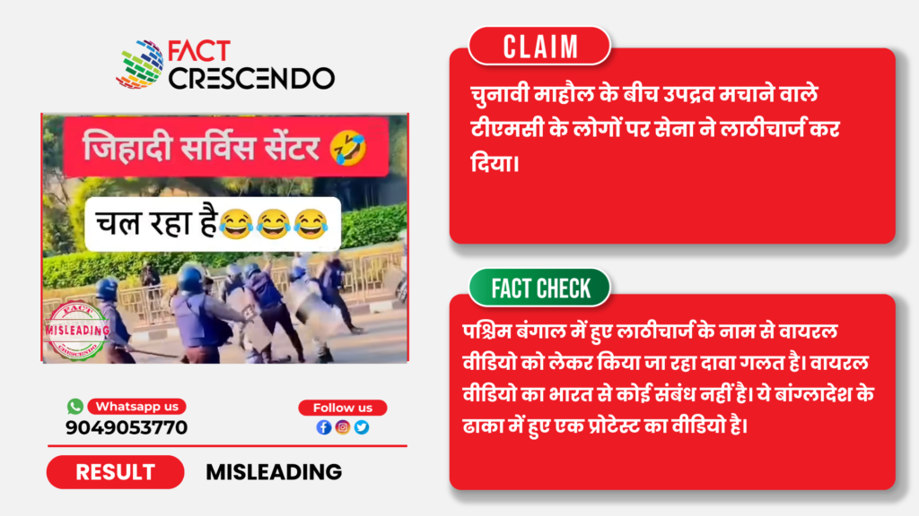 तमिलनाडु और पश्चिम बंगाल में विधानसभा चुनाव के लिए अभी वोटिंग होना बाकी है। इसी चुनावी माहौल के बीच लाठीचार्ज का एक वीडियो सोशल मीडिया पर तेजी से वायरल हो रहा है, जिसे शेयर करते हुए दावा किया जा रहा है कि पश्चिम बंगाल की मुख्यमंत्री और तृणमूल कांग्रेस की प्रमुख ममता बनर्जी की पार्टी के कार्यकर्ता माहौल खराब करने की कोशिश कर रहे थें, जिस पर सेना ने उन पर लाठीचार्ज कर दिया।