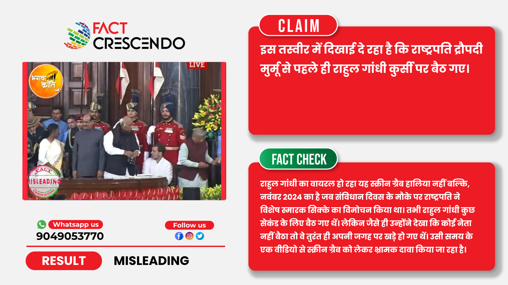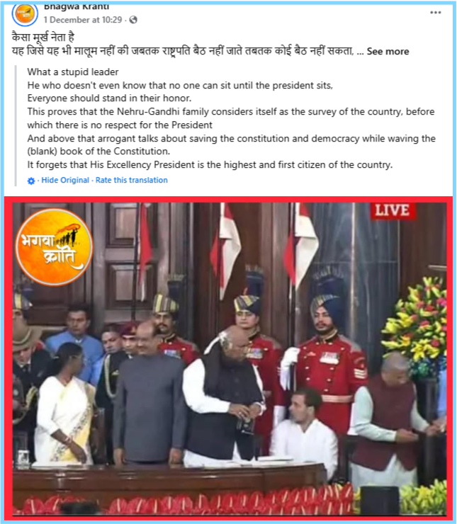तथ्यों के जांच से यह पता चलता है कि राष्ट्रपति द्रौपदी मुर्मू के सामने बैठे राहुल गांधी का वायरल वीडियो ग्रैब हालिया नहीं बल्कि, पिछले साल का है। जब संविधान दिवस के मौके पर आयोजित विमोचन कार्यक्रम के दौरान राहुल गांधी कुछ सेकंड के लिए गलती से बैठ गए थें। लेकिन वे तुरंत ही अपनी गलती का एहसास करते हुए उठ गए थें। उसी समय के वीडियो ग्रैब को अब राहुल गांधी के खिलाफ दुष्प्रचार की मंशा से फैलाया जा रहा है।