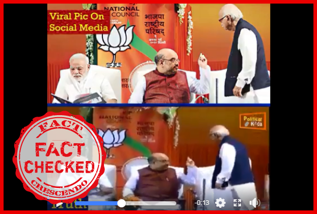 १६ अप्रैल २०१९ को फेसबुक पर ‘With Arvind Kejriwal’ नामक पेज पर साझा किया गया यह पोस्ट दो हजार से ज्यादा बार शेयर किया जा चूका है | पोस्ट में एक फोटो तथा विडियो दिया गया है | फोटो में तीन लोग दीखते है- प्रधानमंत्री नरेन्द्र मोदी, भाजपाध्यक्ष अमित शाह और बीजेपी के वरिष्ठ नेता लालकृष्ण अडवाणी | अमित शाह अडवाणी को पीछे की तरफ किसी बात का इशारा कर रहे है | मोदी कोई किताब पढने में व्यग्र है | पीछे की तरफ एक डायस है, जिसपर लिखा है भाजपा राष्ट्रीय परिषद | नीचे के विडियो में भी यही वाकया बयान किया गया है | उपर के फोटो पर लिखा है, viral pic on social media और नीचे विडियो पर लिखा है, Truth | पोस्ट की हैडलाइन में दावा किया गया है की- खुलेआम बेइज्जती! अहंकार की पराकाष्ठा अपने वुजर्ग नेता को पीछे भेज रहे है जिन्होंने पार्टी को खड़ा किया।