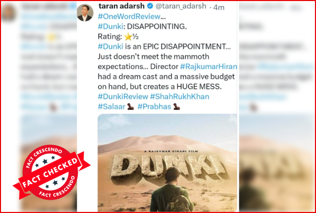 तथ्य-जांच के बाद हमने पाया कि, फिल्म फिल्म समीक्षक तरण आदर्श का एक एडिटेड ट्वीट फिल्म डंकी के बेकार रिव्यू के दावे के साथ वायरल किया जा रहा है।