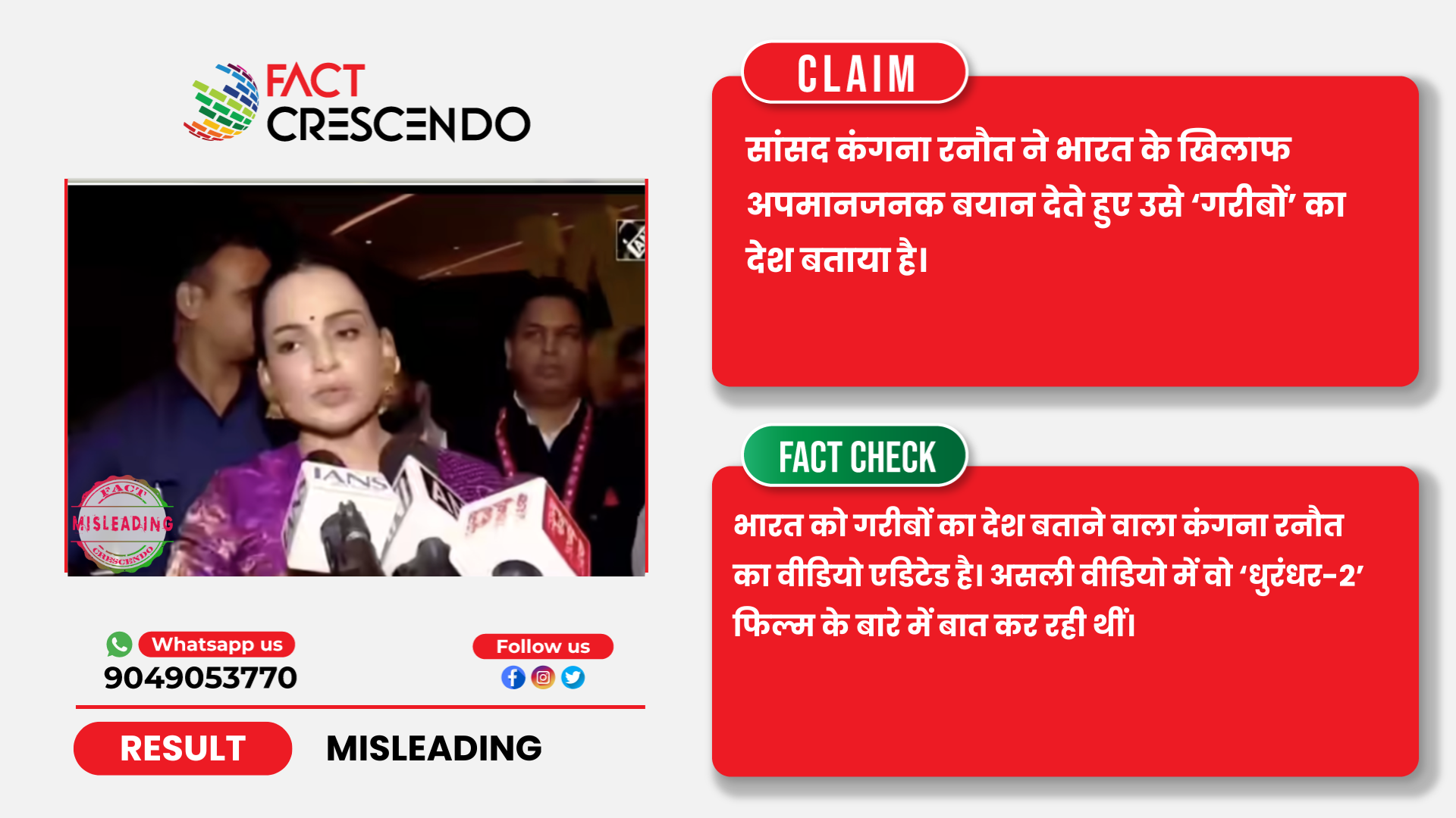 निष्कर्ष- तथ्य-जांच के बाद हमने पाया कि, भारत को गरीबों का देश बताने वाला कंगना रनौत का वायरल यह वीडियो एडिटेड है। असली वीडियो में वो ‘धुरंधर-2’ फिल्म के बारे में बात कर रही थीं और कह रही थीं कि पहले फिल्मों में भारत को गलत तरीके से भूखा-नंगा दिखाया जाता था। अब फिल्मों के जरिए नए भारत की तस्वीर दिखाई जा रही है।