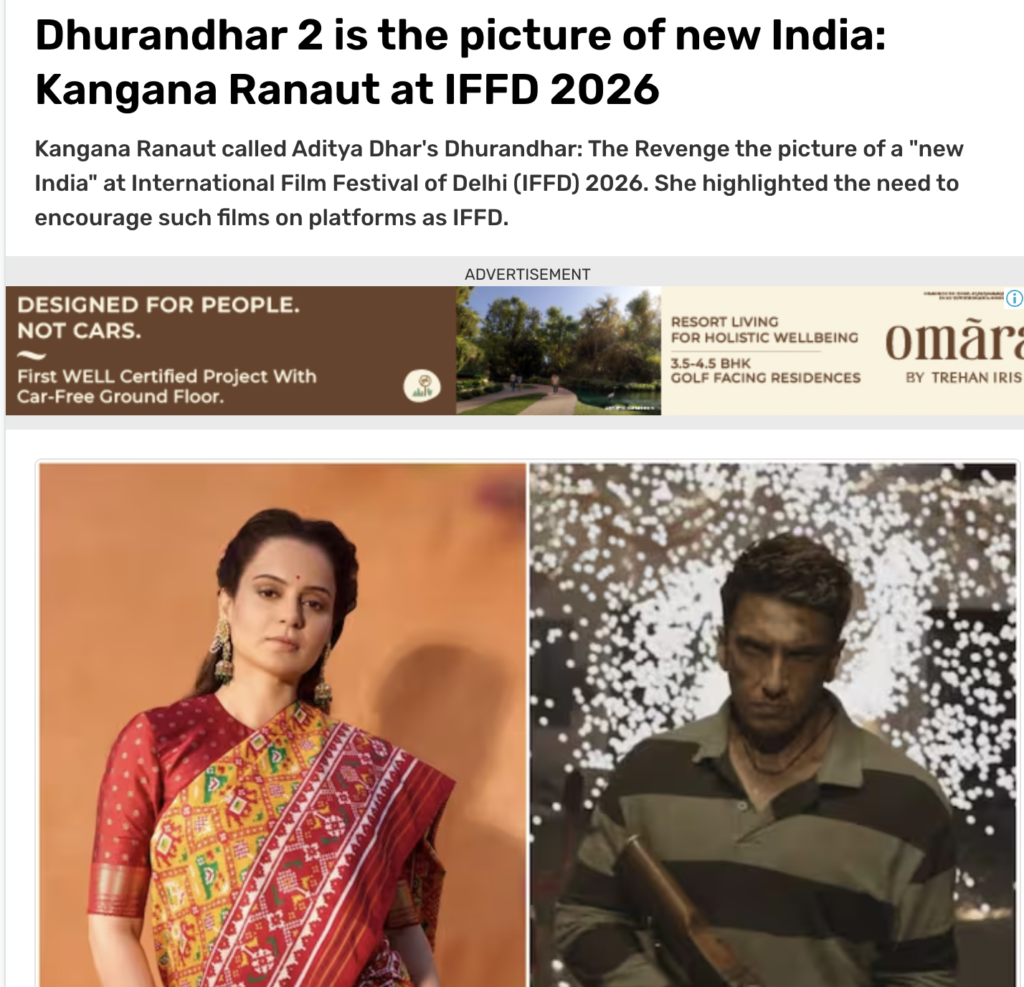वीडियो में 1 मिनट 42 सेकंड से देखा जा सकता है कि जब रिपोर्टर धुरंधर-2 फिल्म को लेकर सवाल करती हैं, तब कंगना रनौत जवाब देते हुए कहती हैं, “देखिए ये… ये प्लेटफॉर्म में आज, ये प्लेटफॉर्म है ही ऐसी फिल्मों को, जो कि भारत जो है, एक, एक भूखा-नंगा, एक जो है, एक ऐसी जगह है, उन फिल्मों से अब उभरकर ये नए भारत की तस्वीर है।
