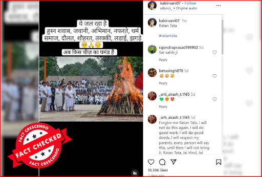 दिग्गज़ उद्योगपति रतन टाटा के हाल में हुए निधन के बाद उनके अंतिम संस्कार से जोड़ते हुए एक तस्वीर वायरल हो रही है। तस्वीर में एक जलती हुई चिता दिखाई दे रही है और उसके आस-पास कई लोग खड़े दिखाई दे रहे हैं। इस तस्वीर को रतन टाटा के अंतिम संस्कार की तस्वीर के दावे से शेयर किया जा रहा है। वहीं पोस्ट में एक टेक्स्ट है जो इस प्रकार है…