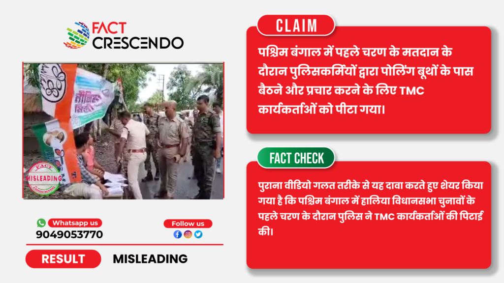 पश्चिम बंगाल विधानसभा चुनाव 2026 के लिए मतदान समाप्त हो गया है। गुरुवार को बंगाल में पहले चरण के तहत 16 जिलों की 152 सीटों पर वोट पड़ रहे हैं। इसी बीच सोशल मीडिया पर एक वीडियो साझा किया जा रहा है, जिसमें यह दावा किया जा रहा है कि यह वीडियो 23 अप्रैल 2026 को पश्चिम बंगाल विधानसभा चुनावों के पहले चरण के दौरान मतदान केंद्रों के पास बैठने और प्रचार करने के लिए TMC कार्यकर्ताओं को पीटते हुए पुलिसकर्मियों को दिखा रहा है।