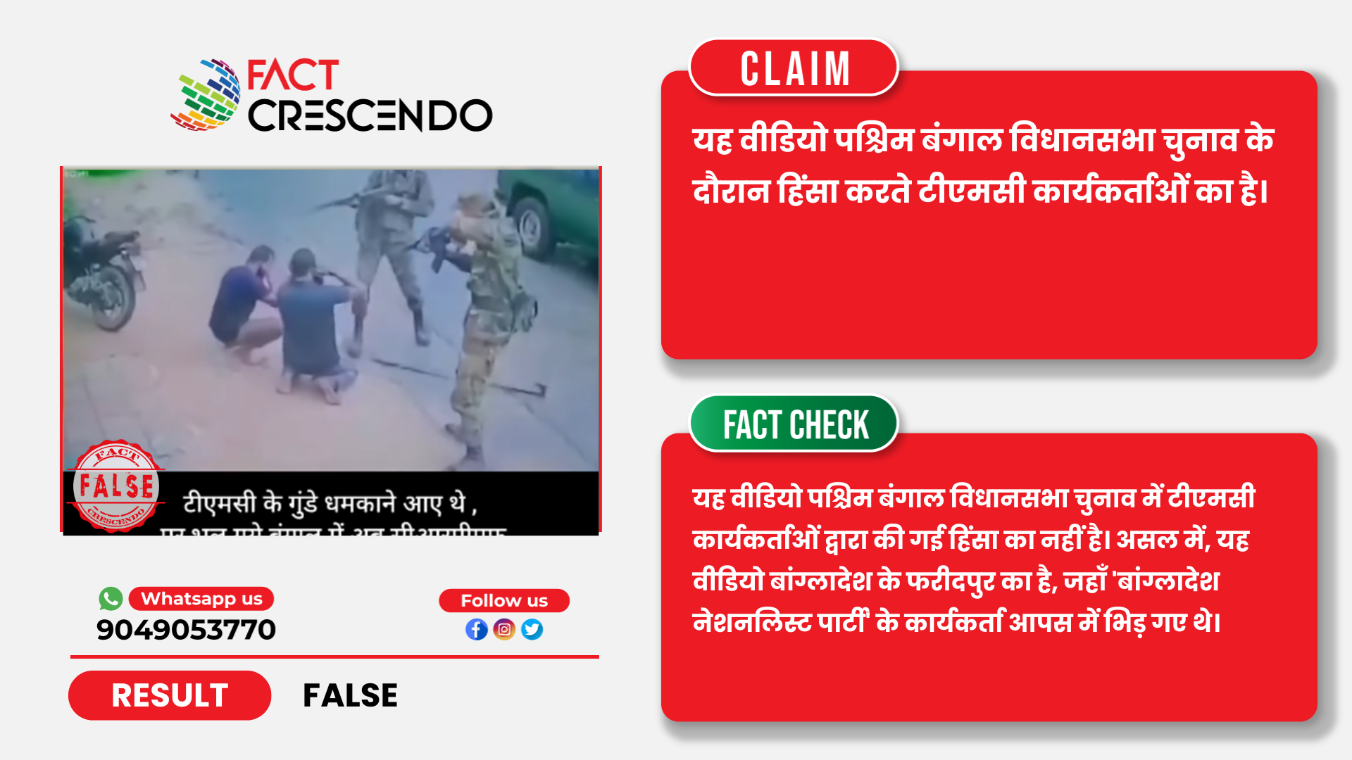 इस वीडियो का पश्चिम बंगाल विधानसभा चुनाव में टीएमसी कार्यकर्ताओं द्वारा हिंसा किए जाने से कोई संबंध नहीं है। यह बांग्लादेश के फरीदपुर का है, जब बांग्लादेश नेशनलिस्ट पार्टी के कार्यकर्ता आपस में भिड़ गए थें।