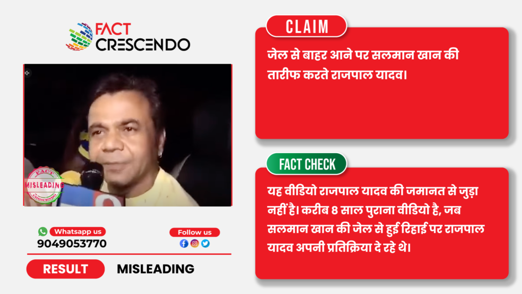 सोशल मीडिया पर बॉलीवुड अभिनेता राजपाल यादव का एक वीडियो तेजी से वायरल हो रहा है, जिसमें राजपाल यादव मीडिया से बात करते हुए सलमान खान की जमकर तारीफ कर रहे हैं। इस दौरान रिपोर्टर राजपाल से सवाल पूछता है, “बेल मिला है, ख़ुशी की बात है, क्या कहना चाहेंगे?” इसके जवाब में राजपाल कहते हैं, “ये कह सकता हूं कि सलमान भाई बड़े भाई की तरह हैं, सलमान भाई का आज घर में उनके साथ बैठकर, हम लोगों को बहुत ख़ुशी महसूस हुई।” यह वीडियो शेयर कर दावा किया जा रहा है कि यह वीडियो उनको जमानत मिलने के बाद का है और उन्होंने मदद करने के लिए अभिनेता सलमान खान को शुक्रिया कहा है।
