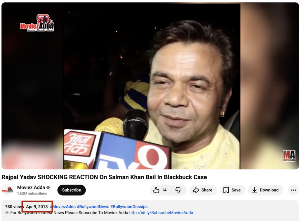 जांच में आगे हमें वायरल वीडियो ‘MF News’ के यूट्यूब चैनल पर भी मिला। 9 अप्रैल 2018 को अपलोड इस वीडियो में बताया गया है कि काला हिरण मामले में सलमान खान को जमानत मिलने के बाद राजपाल यादव ने यह बयान दिया था।