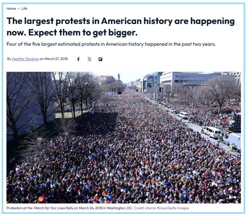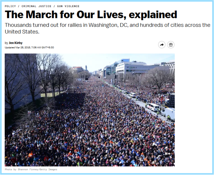 हमें मिली वॉक्स डॉट कॉम की वेबसाइट पर रिपोर्ट के अनुसार,’मार्च फ़ॉर आवर लाइव्स’ रैली के दौरान वाशिंटन समेत अमेरिका के कई शहरों में हजारों लोगों ने प्रदर्शन किया था। वहीं रिपोर्ट 25 मार्च 2018 को प्रकाशित किया गया है।