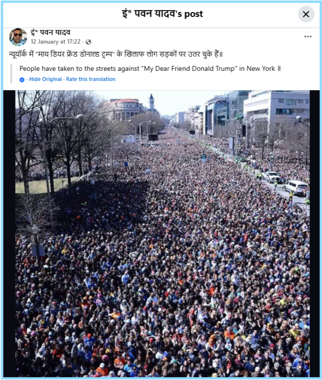 सोशल मीडिया पर एक तस्वीर को काफी वायरल किया जा रहा है, जिसे ईरान की वर्तमान सरकार के खिलाफ जारी विरोध प्रदर्शनों के बीच फैलाया जा रहा है। इसमें दिखाई दे रहा है कि सड़कों पर हजारों की भीड़ दिखाई दे रही है। पोस्ट को हालिया बताकर शेयर करते हुए दावा किया जा रहा है कि अमेरिका के न्यूयॉर्क शहर में राष्ट्रपति डोनाल्ड ट्रंप के खिलाफ हजारों की संख्या में प्रदर्शनकारी प्रदर्शन कर रहे हैं। पोस्ट के साथ कैप्शन में लिखा गया है…