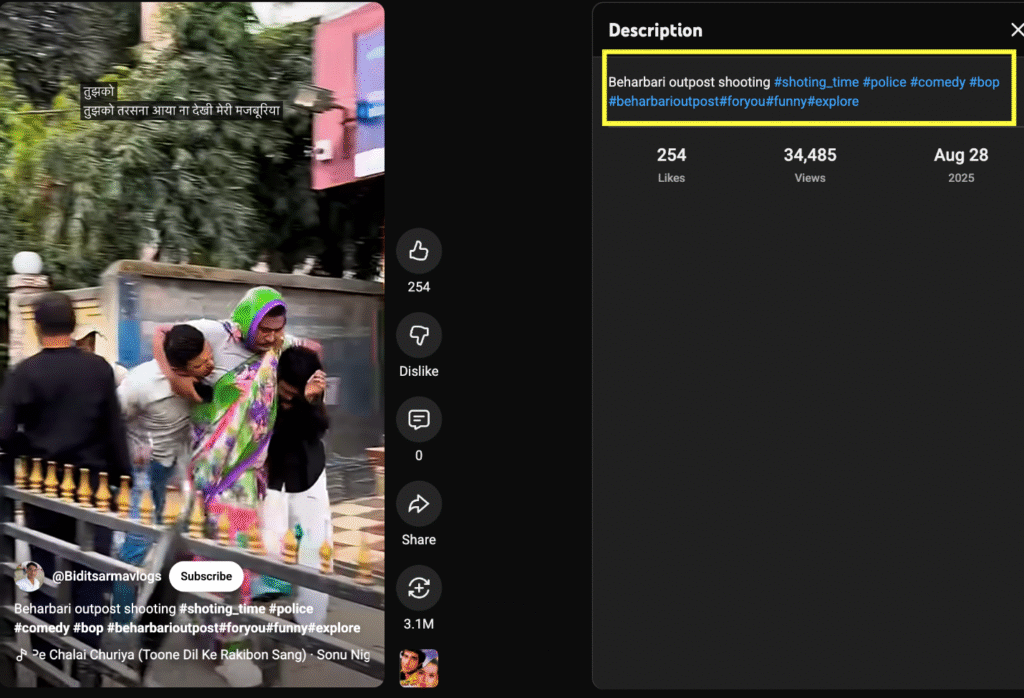 अधिक सर्च करने पर उसी चैनल पर, हमें शो के फिल्मांकन स्थान के कई (बीटीएस) बिहाइंड-द-सीन वीडियो मिले। इन क्लिप में वही पुलिस अधिकारी और कथित उपद्रवी दिखाई दे रहे हैं जो वायरल वीडियो में दिख रहे हैं, और उनमें से एक ने स्क्रिप्ट भी पढ़ी है, जिससे पुष्टि होती है कि यह दृश्य नाटकीय था।