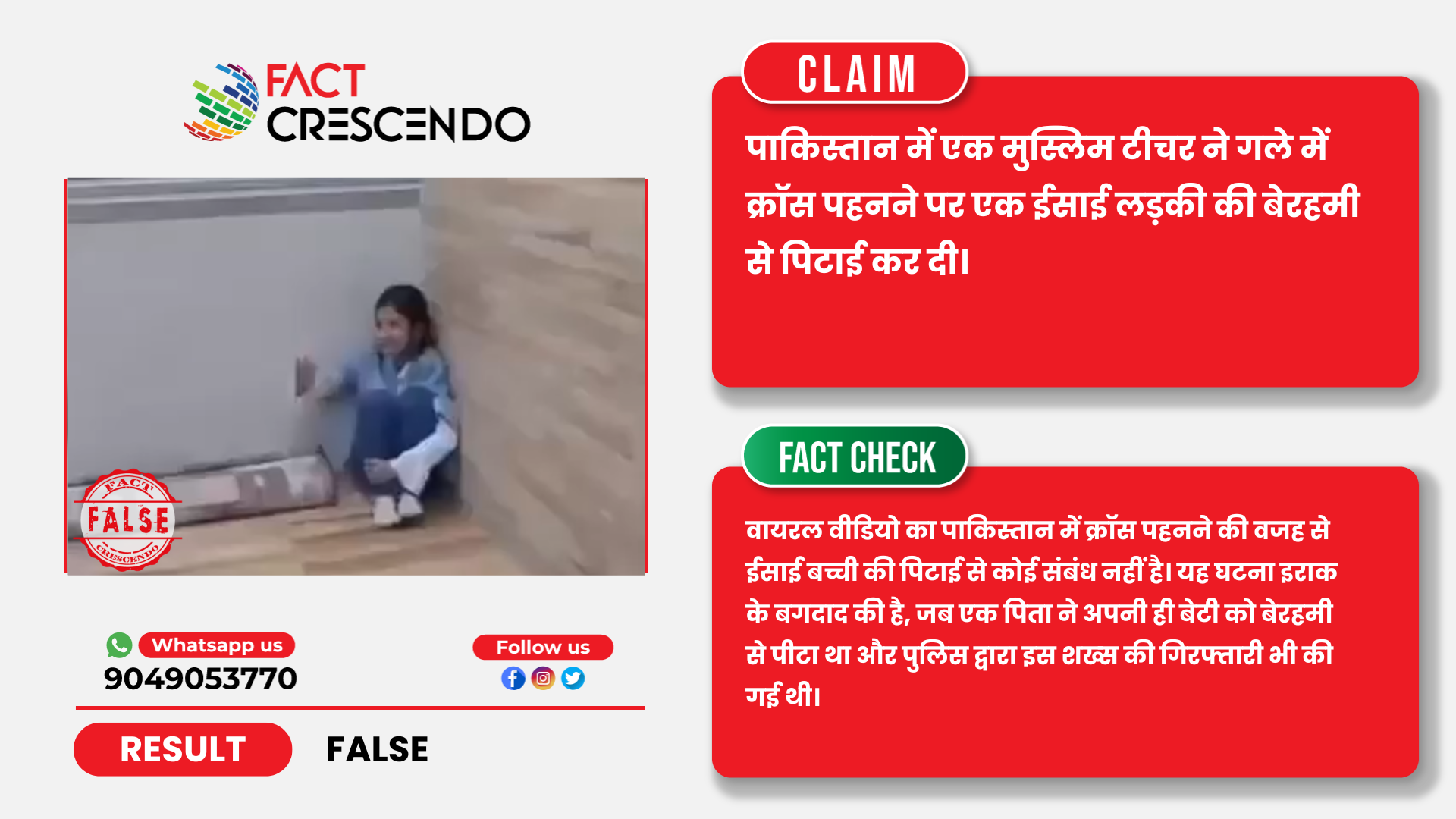 तथ्यों के जांच से यह पता चलता है कि वायरल वीडियो के साथ पाकिस्तान में क्रॉस पहनने पर बच्ची को स्कूल टीचर द्वारा बेरहमी से पीटने का फर्जी दावा किया जा रहा है। असल में यह वीडियो अक्टूबर 2025 का है जब इराक के बगदाद में एक पिता ने अपनी ही बेटी की बेरहमी से पिटाई की थी और वीडियो वायरल होने का बाद उक्त शख्स की गिरफ्तारी भी की गई थी।