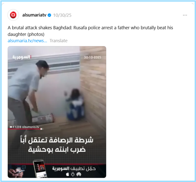 इसके बाद हमें प्रमुख इराकी समाचार चैनल अल-सुमारिया टीवी की तरफ से थ्रेड पर एक पोस्ट मिली, जिसमें बताया गया था कि बगदाद में एक पिता ने अपनी छोटी बेटी को पीटा था और अल-रुसाफा पुलिस ने उसे गिरफ्तार कर लिया था।