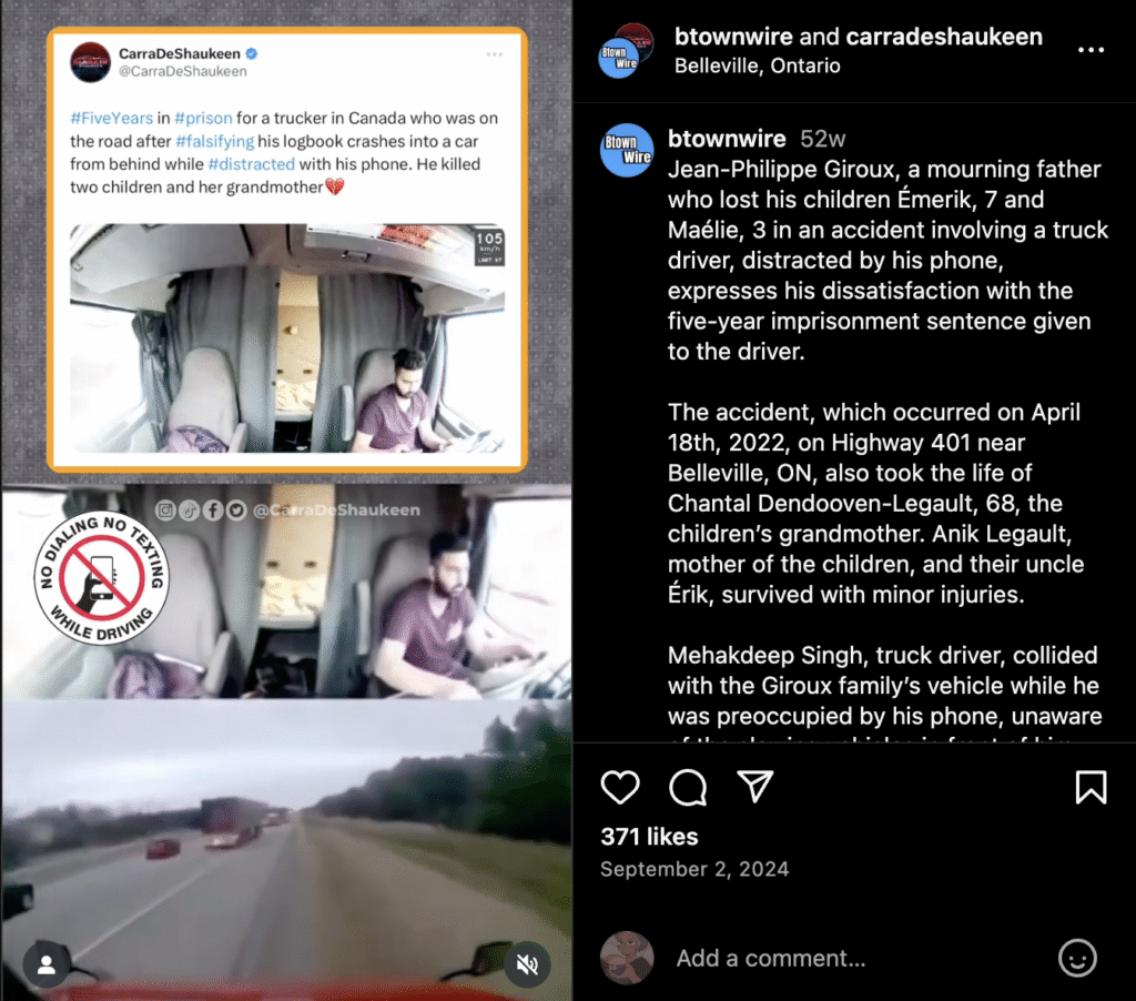 मिली जानकारी की मदद लेते हुए अधिक सर्च करने पर हमें यह वीडियो एक इंस्टाग्राम हैंडल पर मिला। 2 सितंबर 2024 को पोस्ट किए गए वीडियो में जानकारी दी गई थी कि , ट्रक और गाड़ी के टकराव की यह दुर्घटना कनाडा में अप्रैल 2022 में घटी थी।