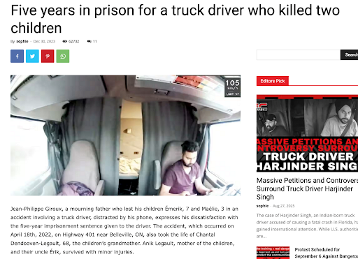 ट्रक्स टॉप कनाडा डॉट कॉम की खबर के अनुसार, इस घटना में दोषी पाए गए ट्रक ड्राइवर महकदीप सिंह को अदालत ने पांच साल की सजा सुनाई । खबर के मुताबिक ये हादसा ओंटारियो में बेलेविले के पास हाईवे-401 पर हुआ था। महकदीप ट्रक चलाते समय अपने फोन में व्यस्त था जिससे वो अपने आगे धीमी होती गाड़ियों का अंदाजा नहीं लगा पाया। महकदीप को इस मामले में 5 साल की सजा हुई । निम्न में खबर देखें।