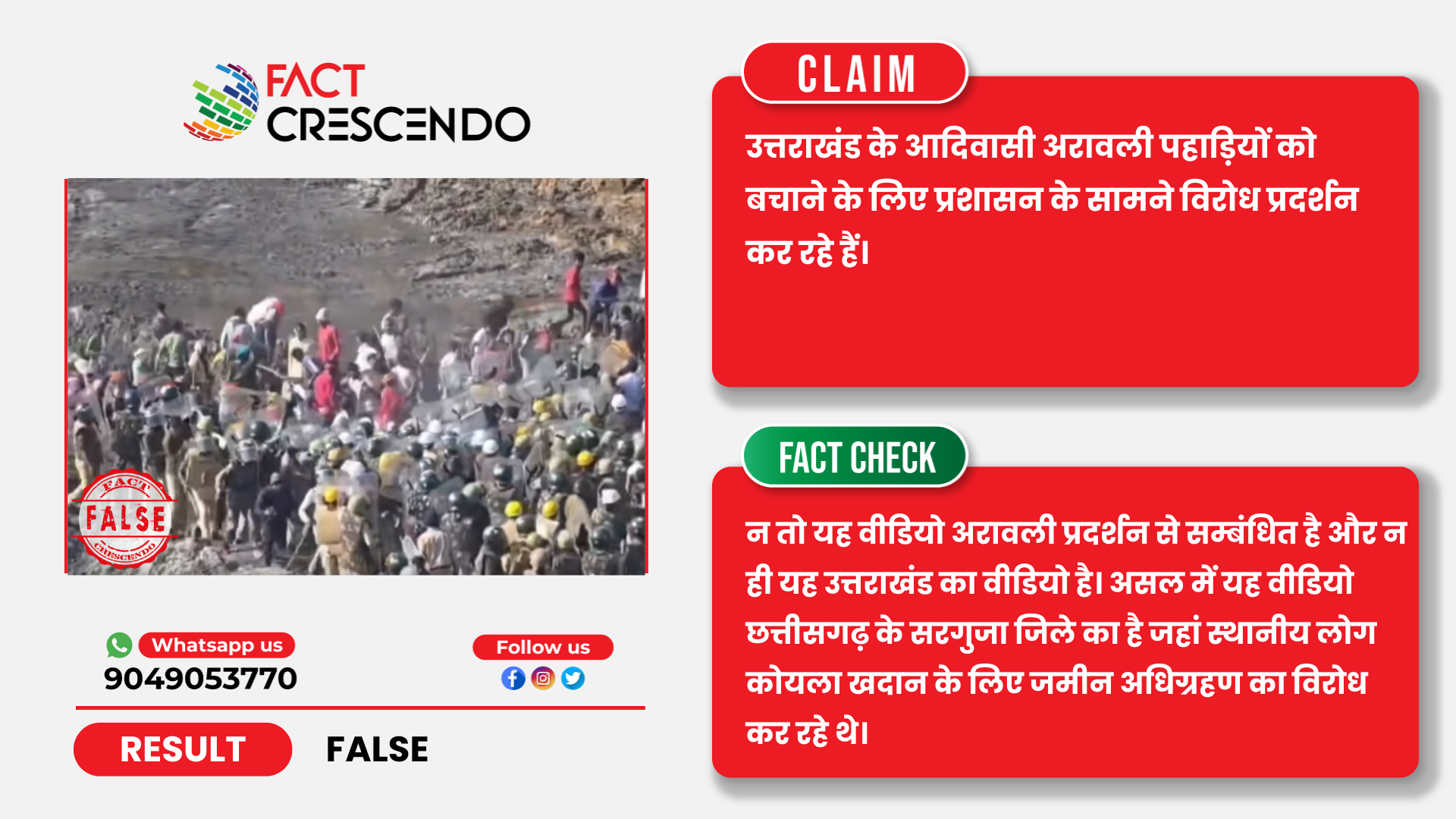 तथ्यों के जांच से यह पता चलता है कि अरावली को बचाने के लिए किए जा रहे प्रदर्शन के नाम पर असंबंधित वीडियो फैलाया जा रहा है। यह उत्तराखंड में आदिवासियों द्वारा अरावली को लेकर किए जा रहे विरोध प्रदर्शन का नहीं है। बल्कि, छत्तीसगढ़ के सरगुजा में अमेरा कोयला खादान के विस्तार के विरोध में किए गए प्रदर्शन का है, जिसमें ग्रामीणों और पुलिस के बीच भयंकर झड़प हुई थी।