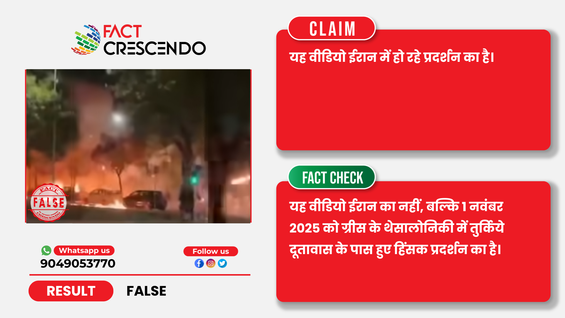 तथ्यों के जांच से पता चलता है कि वायरल वीडियो असल में ग्रीस के थेसालोनिकी शहर का है जब 1 नवंबर 2025 को फेमस रैपर लेक्स के शो के बाद युवाओं और पुलिस के बीच झड़प हो गई थी। उसी समय के वीडियो को ईरान में हो रहे हालिया प्रदर्शन के नाम पर भ्रामक दावे से फैलाया जा रहा है।