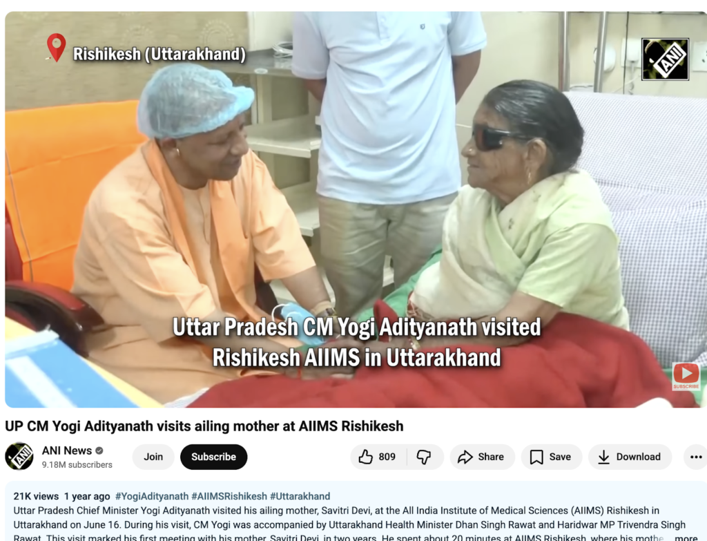 मिली जानकारी की मदद लेते हुए अधिक सर्च करने पर हमें टाइम्स नाउ नवभारत के यूट्यूब चैनल पर वायरल वीडियो का बड़ा वर्जन मिला। 16 जून 2024 को अपलोड इस वीडियो के साथ बताया गया कि सीएम योगी ने अपनी मां सावित्री देवी से ऋषिकेश के एम्स में मुलाकात की।