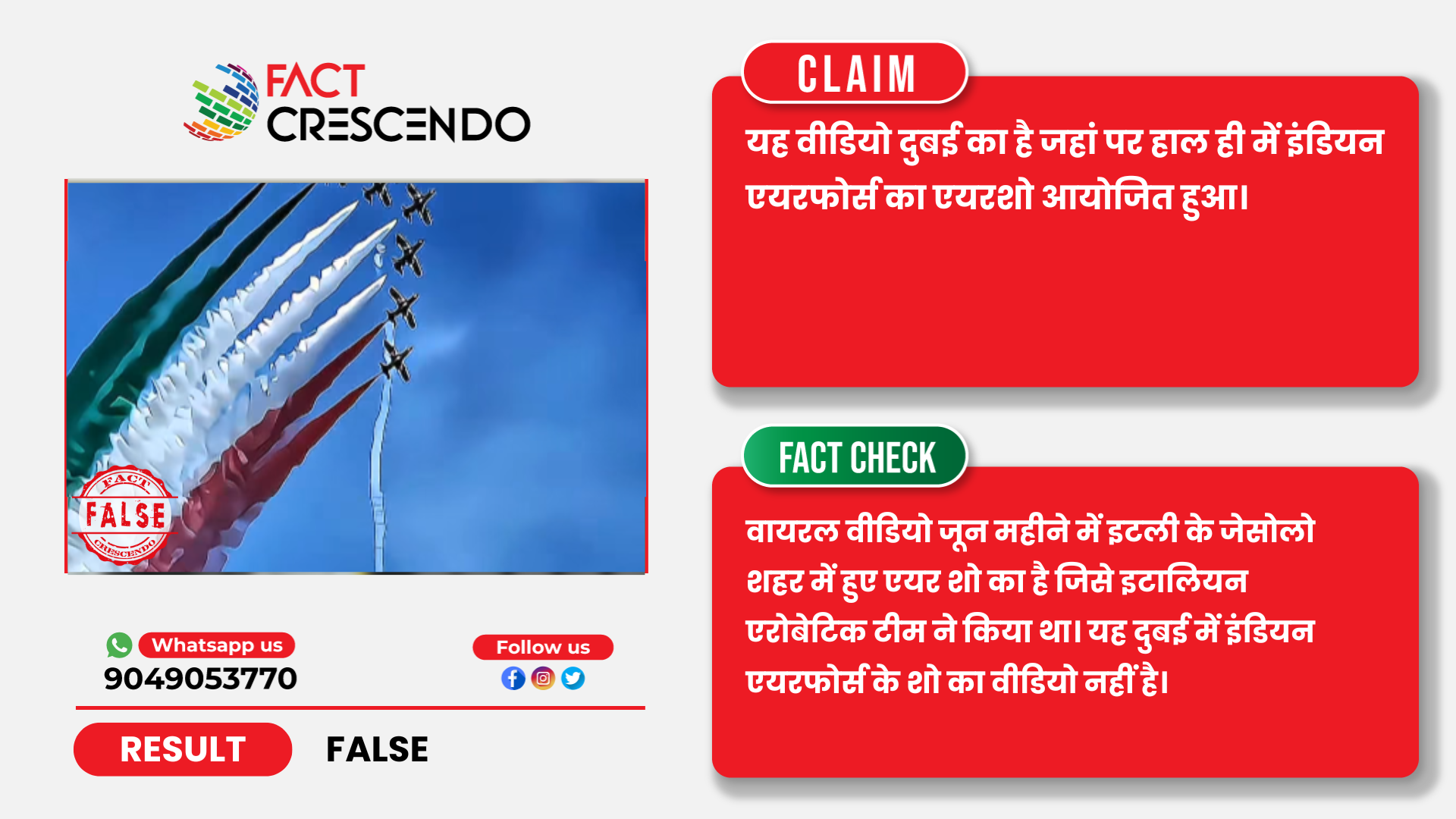 दुबई एयरशो में इंडियन एयरफोर्स के नाम पर इटली में हुए एयरशो का वीडियो वायरल किया जा रहा है।
