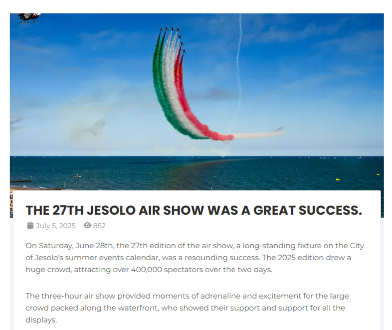 वहीं इस एयर शो की आधिकारिक वेबसाइट पर जानकारी के अनुसार, इस साल 27 से 28 जून 2025 को इस इवेंट का सफल आयोजन किया गया था। Jesolo के समुद्र तट पर इस प्रदर्शन को देखने के लिए दो दिनों में लगभग 4 लाख से अधिक लोगों ने हिस्सा लिया था। इसमें हम वायरल वीडियो वाले एक स्क्रीनशॉट को इस्तेमाल किया हुआ देख सकते हैं।