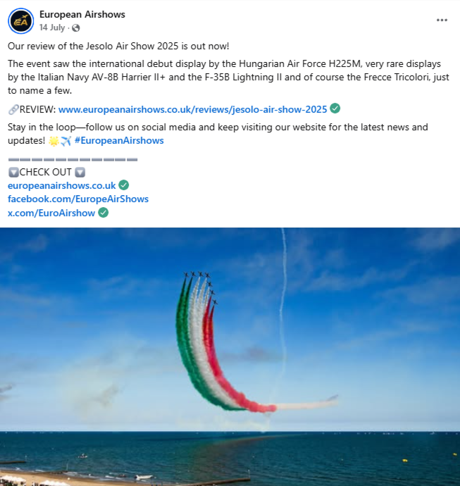 साथ ही हमें प्राप्त हुई यूरोपियन एयर शो की वेबसाइट पर मौजूद जानकारी के से पता चला कि, इस एयर शो को लेकर एक रिव्यू किया गया था। 28 जून 2025 को जेसोलो एयर शो का आयोजन हुआ था। जो एयर शो जेसोलो सिटी द्वारा किया गया था। इस एयर शो के अंत में परंपरा के अनुसार फ्रेचे ट्राईकलरी का प्रदर्शन किया गया था। इटालियन एरोबेटिक टीम के 8 विमानों (7 फॉर्मेशन में और 1 सोलो पायलट वाला) ने शो के करतब की प्रस्तुती दी थी।