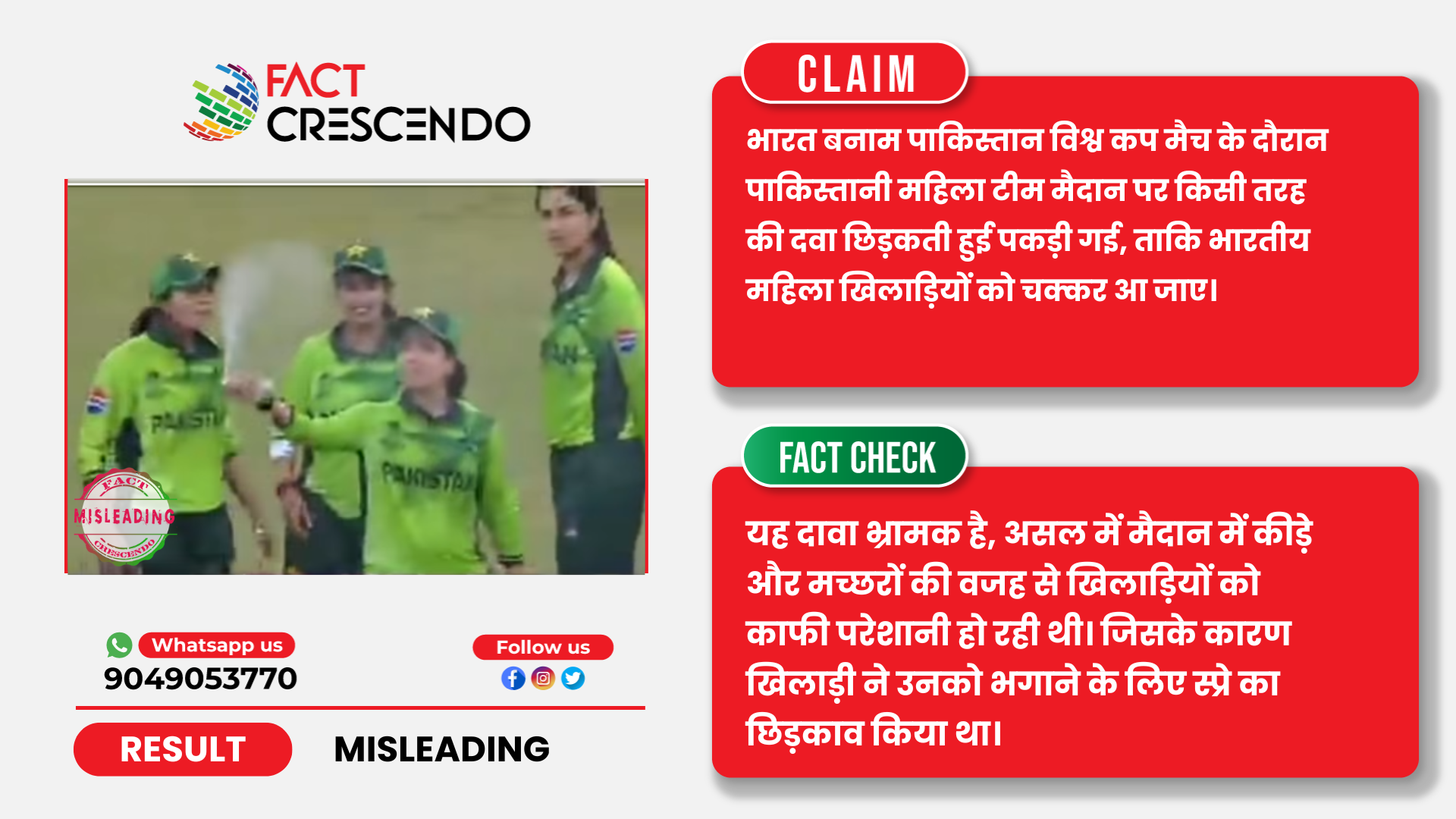 तथ्यों के जांच से यह पता चलता है कि पाकिस्तान महिला टीम ने भारत के साथ हालिया मैच के दौरान पिच पर किसी तरह का स्प्रे नहीं छिड़का था। बल्कि कीड़ों के झुंड आने की वजह से वे कीटनाशक का छिड़काव कर रही थीं, जिसे गलत रूप में फेक दावे के साथ फैलाया जा रहा है।