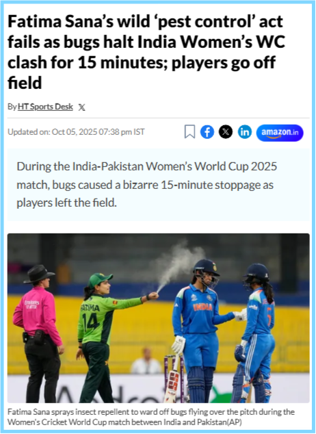हमने जांच की शुरुआत में वीडियो से सम्बंधित कीवर्ड्स को गूगल पर सर्च किया। परिणाम में हमें इससे संबंधित एक मीडिया रिपोर्ट मिली, जिसे हिदुस्तान टाइम्स के हवाले से 5 अक्तूबर को प्रकाशित किया गया था। रिपोर्ट में लिखा था “रविवार को आर. प्रेमदासा स्टेडियम में भारत-पाकिस्तान महिला विश्व कप 2025 के मुकाबले के दौरान एक अजीबोगरीब वाकया देखने को मिला, जब पाकिस्तानी खिलाड़ियों ने कीड़ों के झुंड के कारण खेल को कुछ देर के लिए रोक दिया। इसके बाद कप्तान फ़ातिमा सना ने कीड़ों से अकेले ही मुकाबला किया। हालाँकि उनके “कीट नियंत्रण” के प्रयास कीड़ों को दूर रखने में नाकाम रहे।