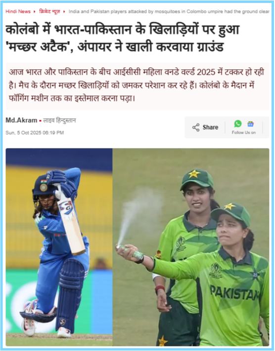 हमें दावे से जुड़ी एक रिपोर्ट न्यूज 18 की वेबसाइट पर भी मिली, जिसे 6 अक्टूबर 2025 को प्रकाशित किया गया था। इसके अनुसार, आईसीसी महिला वनडे वर्ल्ड कप में भारत-पाक के बीच मुकाबला हुआ था जो कोलंबो में रविवार 5 अक्टूबर को खेला गया था। मुकाबले के दौरान मच्छरों के हमले की वजह से 15 मिनट के लिए मैच को रोकना पड़ा। इन मच्छरों पर नियंत्रण करने के लिए पूरे ग्राउंड में धुएं का स्प्रे किया गया था।