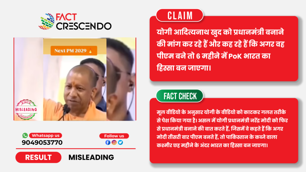 तथ्यों की जाँच से यह स्पष्ट होता है कि वायरल वीडियो के साथ किया जा रहा दावा पूरी तरह से गलत है। असल में, मुख्यमंत्री योगी आदित्यनाथ के ‘पीओके’ वाले मूल संबोधन के एक खास हिस्से को काटकर इस तरह पेश किया गया है, जिससे भ्रम पैदा हो सके कि वे खुद के प्रधानमंत्री बनने की बात कर रहे हैं। जबकि वास्तव में वे नरेंद्र मोदी के तीसरी बार प्रधानमंत्री बनने की बात कर रहे थें।