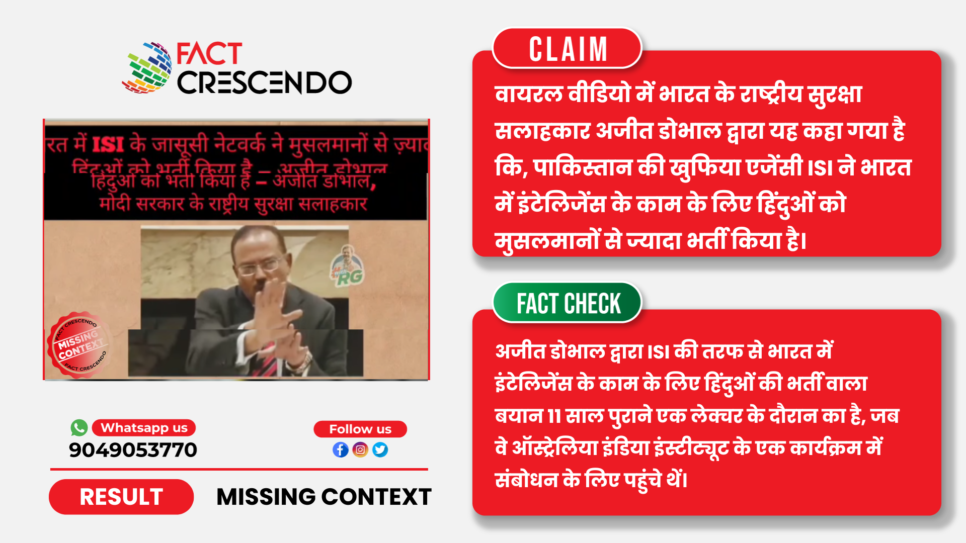 तथ्यों के जांच से पता चलता है कि, अजीत डोभाल का पाक की खुफिया एजेंसी ISI में हिंदुओं की भर्ती वाला वायरल वीडियो अभी के दिनों का नहीं है, बल्कि 11 साल पुराना है। उनके पुराने वीडियो को अभी के संदर्भ में फैलाया गया है।