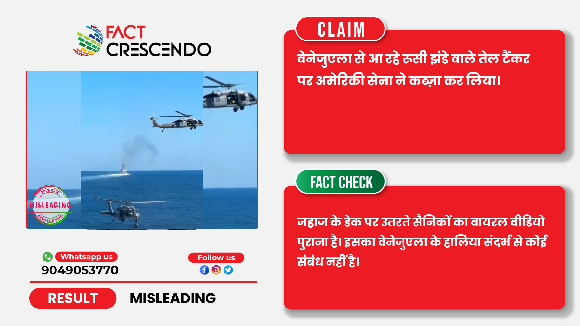 अभी हाल ही में अमेरिका की तरफ से वेनेजुएला में सैन्य अभियान के तहत राष्ट्रपति निकोलस मादुरो की गिरफ्तारी के बाद से उपजा तनाव शांत भी नहीं हुआ था कि अमेरिका ने बीते बुधवार को उत्तरी अटलांटिक महासागर में रूसी झंडा लगे तेल टैंकर को जब्त कर लिया। इस टैंकर की सुरक्षा के लिए रूसी पनडुब्बी भी साथ चल रही थी। लेकिन अमेरिका की इस कार्रवाई से दोनों महाशक्तियों के बीच तनातनी और बढ़ गई है। इसी संदर्भ से जोड़ते हुए इंटरनेट पर एक वीडियो वायरल हो रहा है, जिसमें सैन्य हेलीकॉप्टर से कुछ सैनिकों को जहाज पर उतरते हुए दिखाया गया है। दावा किया जा रहा है कि वेनेजुएला से आ रहे रूसी झंडे वाले तेल टैंकर पर अमेरिकी सेना ने कब्ज़ा कर लिया। वीडियो के साथ कैप्शन लिखा गया है…
