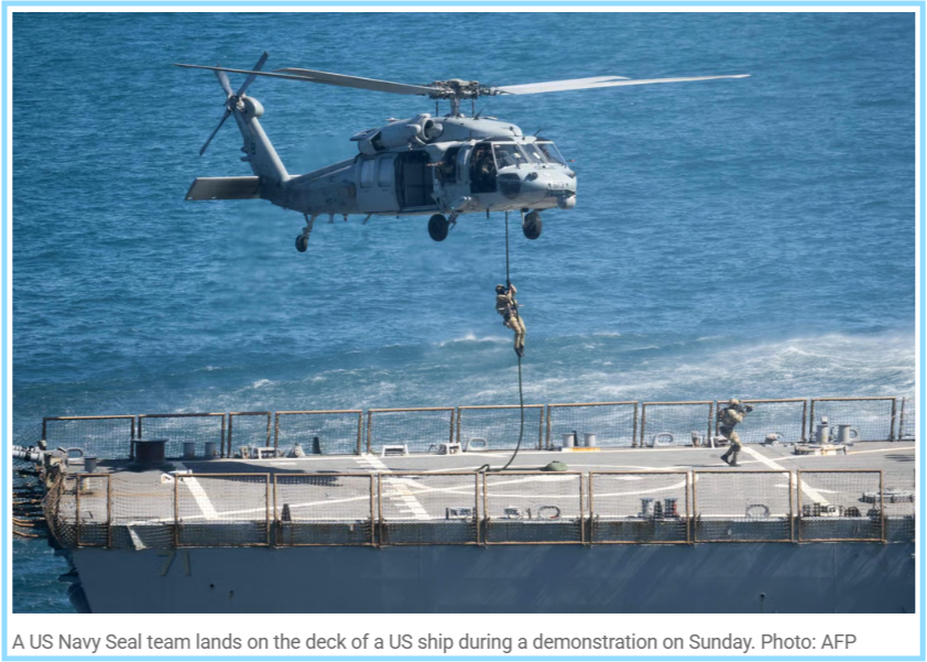 हमने जांच की शुरुआत में सबसे पहले वायरल वीडियो से कीफ्रेम लेकर उसे गूगल लेंस से सर्च किया। परिणाम में हमें साउथ चाइना मार्निंग पोस्ट की वेबसाइट पर 6 अक्टूबर 2025 को इससे जुड़ी रिपोर्ट मिली। इसमें हमें वायरल वीडियो वाली एक तस्वीर मिली। जिसका कैप्शन था, “रविवार को एक प्रदर्शन के दौरान अमेरिकी नौसेना की टीम एक अमेरिकी जहाज के डेक पर उतरी। जबकि खबर के अनुसार, अमेरिकी राष्ट्रपति डोनाल्ड ट्रंप ने नौसेना की 250वीं सालगिरह पर 10,000 नौसैनिकों को संबोधित किया। उन्होंने वर्जीनिया के नॉरफॉक में अमेरिकी नौसेना की जमकर तारीफ की।“