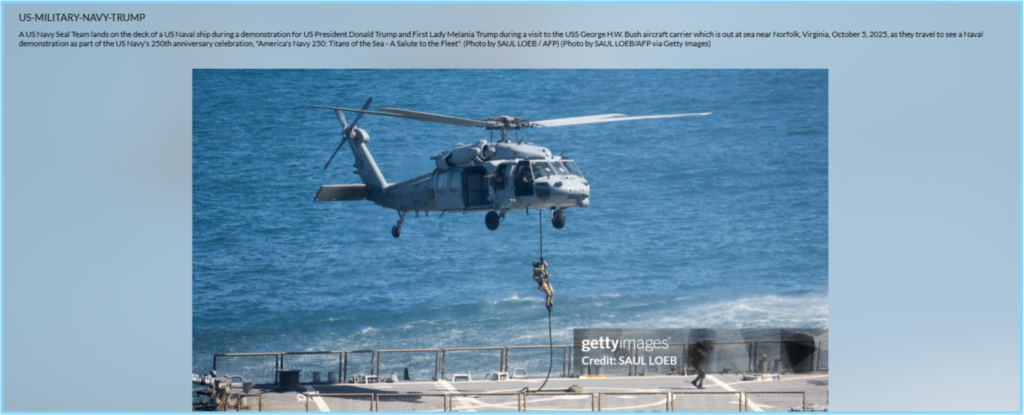 हमें गेट्टी इमेजेज पर भी वायरल वीडियो से मिलती हुई यहीं तस्वीर दिखाई दी। जिसके साथ कैप्शन में लिखा था,”5 अक्टूबर 2025 को अमेरिकी राष्ट्रपति डोनाल्ड ट्रंप और फर्स्ट लेडी मेलानिया ट्रंप के लिए एक प्रदर्शन के दौरान US नेवी सील टीम USS जॉर्ज एच.डब्ल्यू. बुश एयरक्राफ्ट कैरियर के डेक पर उतरी। यह एयरक्राफ्ट कैरियर नॉरफॉक, वर्जीनिया के पास समुद्र में था।”