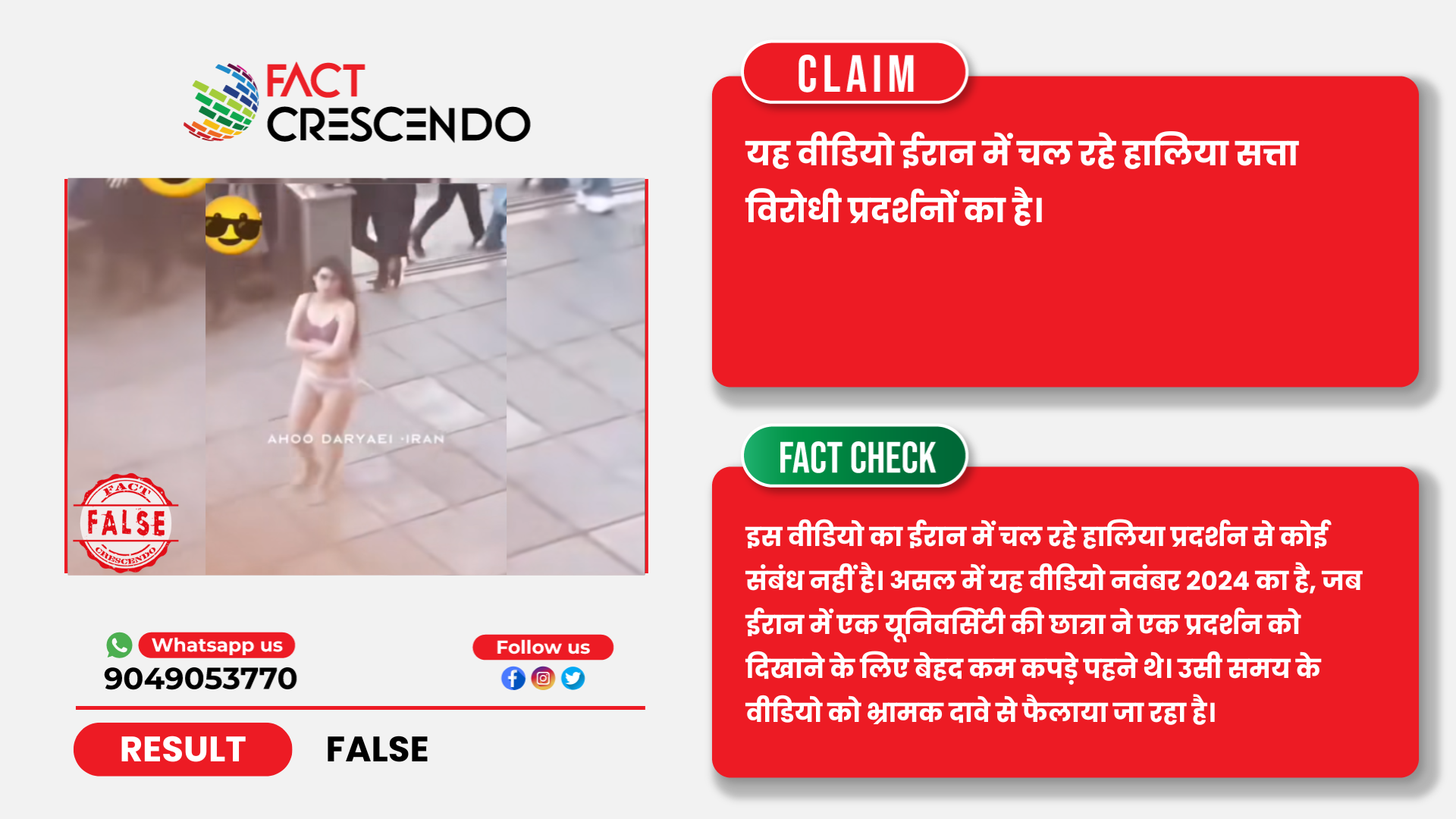 तथ्यों के जांच से यह पता चलता है कि वायरल वीडियो के साथ किया जा रहा दावा गलत है। असल में यह वीडियो नवंबर 2024 का है, जब ईरान में एक यूनिवर्सिटी की छात्रा ने प्रोटेस्ट के तौर पर कम कपड़े पहनकर प्रदर्शन किया था। उसी समय के पुराने वीडियो को ईरान में चल रहे हालिया प्रदर्शनों से जोड़ते हुए भ्रामक रूप से साझा किया जा रहा है।