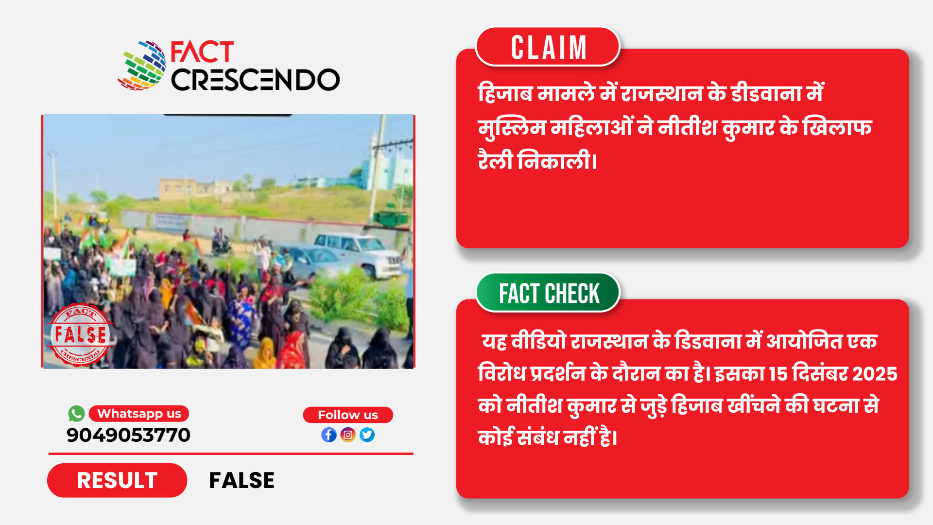15 दिसंबर 2025 को पटना में एक सरकारी कार्यक्रम में बिहार के मुख्यमंत्री नीतीश कुमार द्वारा एक महिला का हिजाब खींचने से जुड़े विवाद के संदर्भ में, इंटरनेट पर एक वीडियो शेयर किया जा रहा है। इसमें मुस्लिम महिलाओं के विरोध प्रदर्शन को दर्शाया गया है। दावा किया जा रहा है कि डीडवाना में नीतीश कुमार के खिलाफ हिजाब मामले को लेकर विरोध प्रदर्शन हुए हैं। वीडियो इस कैप्शन के साथ शेयर किया जा रहा है…