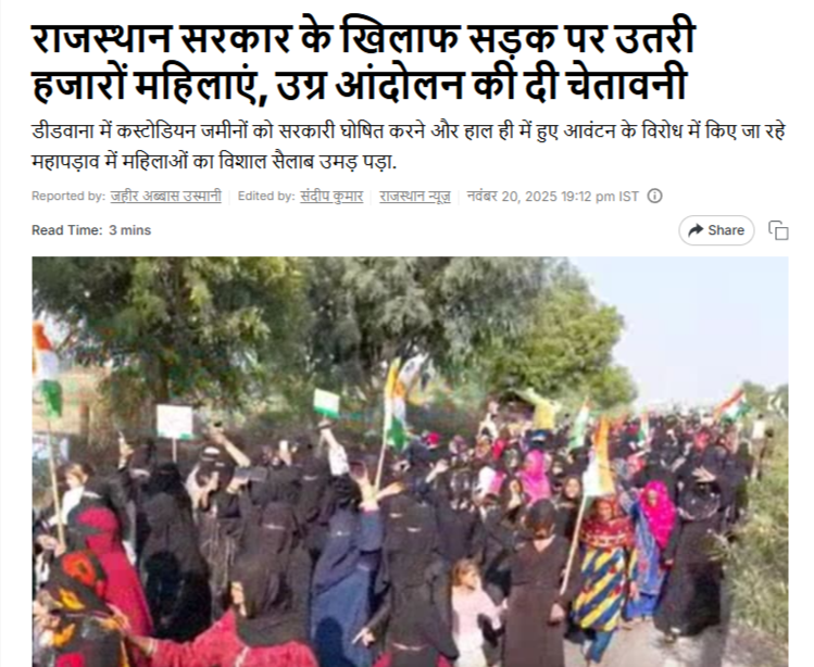 हमें एनडीटीवी राजस्थान की वेबसाइट पर 20 नवंबर को छपी खबर में भी महिलाओं की रैली की तस्वीर अपलोड की हुई मिली। पता चलता है कि, राजस्थान के डीडवाना कलेक्ट्रेट के सामने कस्टोडियन जमीनों को सरकारी घोषित करने और हाल ही में हुए आवंटन के विरोध में चल रहे आंदोलन में महिलाओं ने हिस्सा लिया। जिनकी तरफ से निकाली गई आक्रोश रैली महापड़ाव स्थल से शुरू होकर कलेक्ट्रेट तक पहुंची।