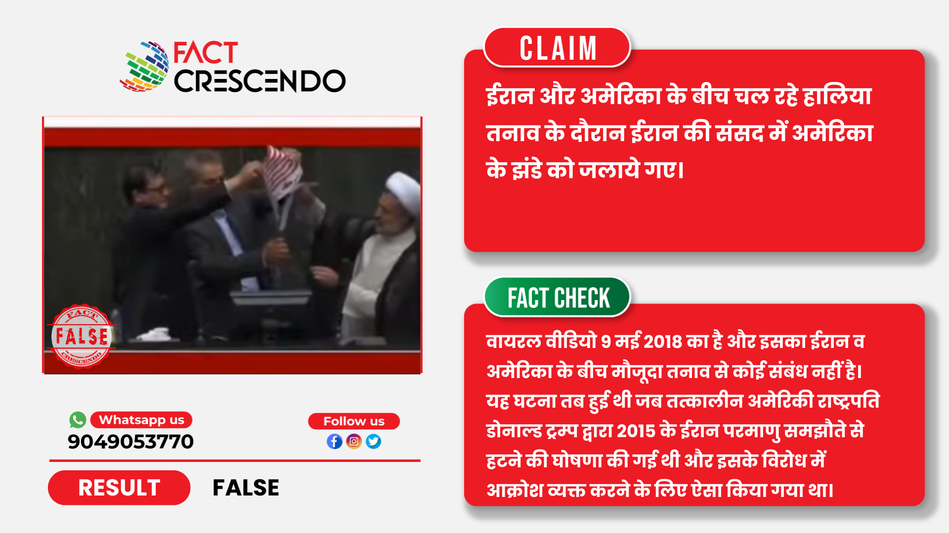 तथ्यों के जांच से यह पता चलता है कि,वायरल वीडियो साल 2018 का है जब अमेरिकी सांसदों द्वारा 2015 के परमाणु समझौते से अमेरिका के हटने के बाद अमेरिकी झंडे को जलाया गया था। उसी समय के वीडियो को ईरान व अमेरिका के बीच मौजूदा तनाव से जोड़कर भ्रामक दावे से फैलाया जा रहा है।