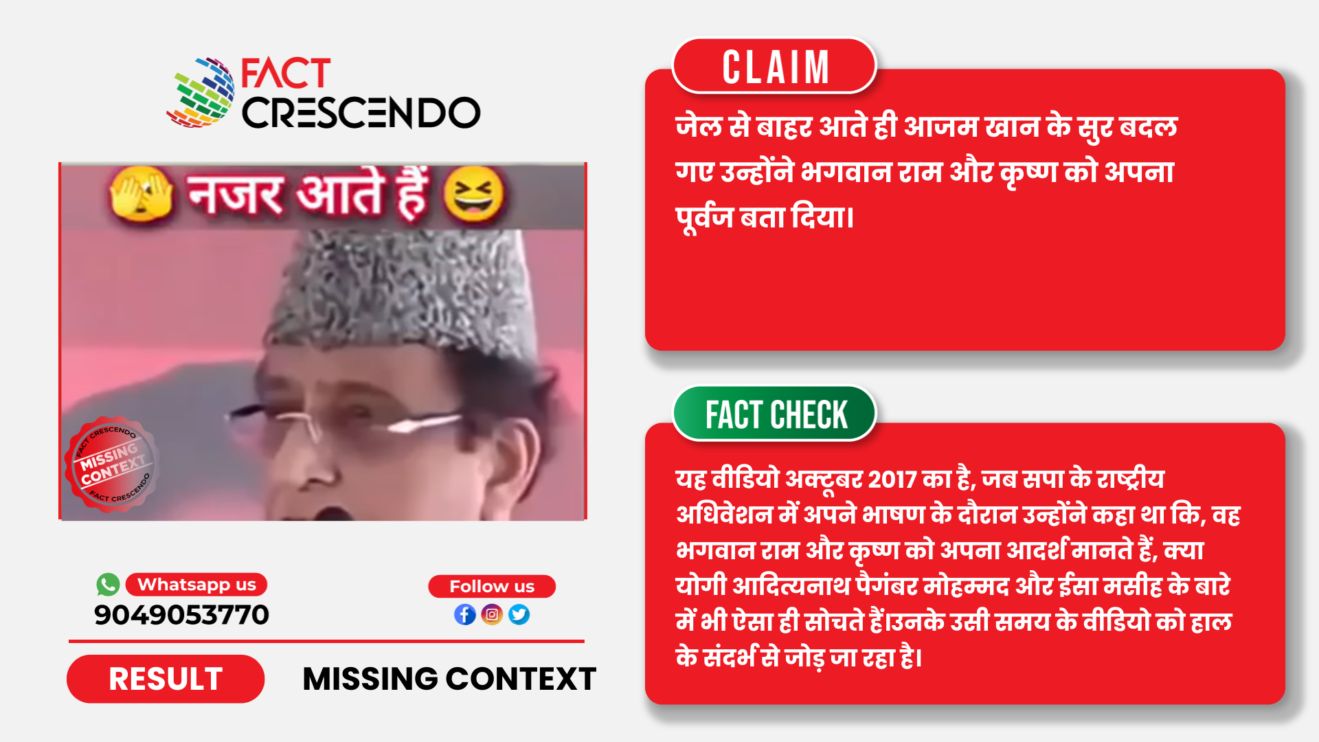 तथ्यों के जांच से यह पता चलता है कि, हाल ही में ज़मानत मिलने के बाद भगवान राम और भगवान कृष्ण को आजम खान ने अपना आदर्श नहीं बताया। बल्कि, उन्होंने यह बात आठ साल पहले आगरा में प्रधानमंत्री मोदी और उत्तर प्रदेश के मुख्यमंत्री योगी आदित्यनाथ पर कटाक्ष करते हुए कही थी। उसी समय के वीडियो को अभी का वीडियो बताया जा रहा है।