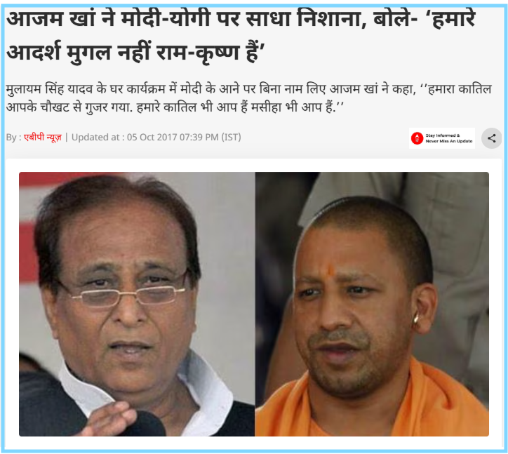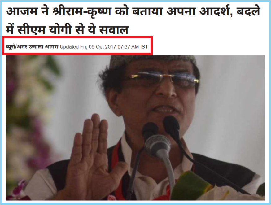 इसी मामले में 5 अक्टूबर 2017 को छपी एबीपी की रिपोर्ट के अनुसार , आजम खान ने यह भाषण सपा के दसवें राष्ट्रीय अधिवेशन के दौरान आगरा में दिया था।