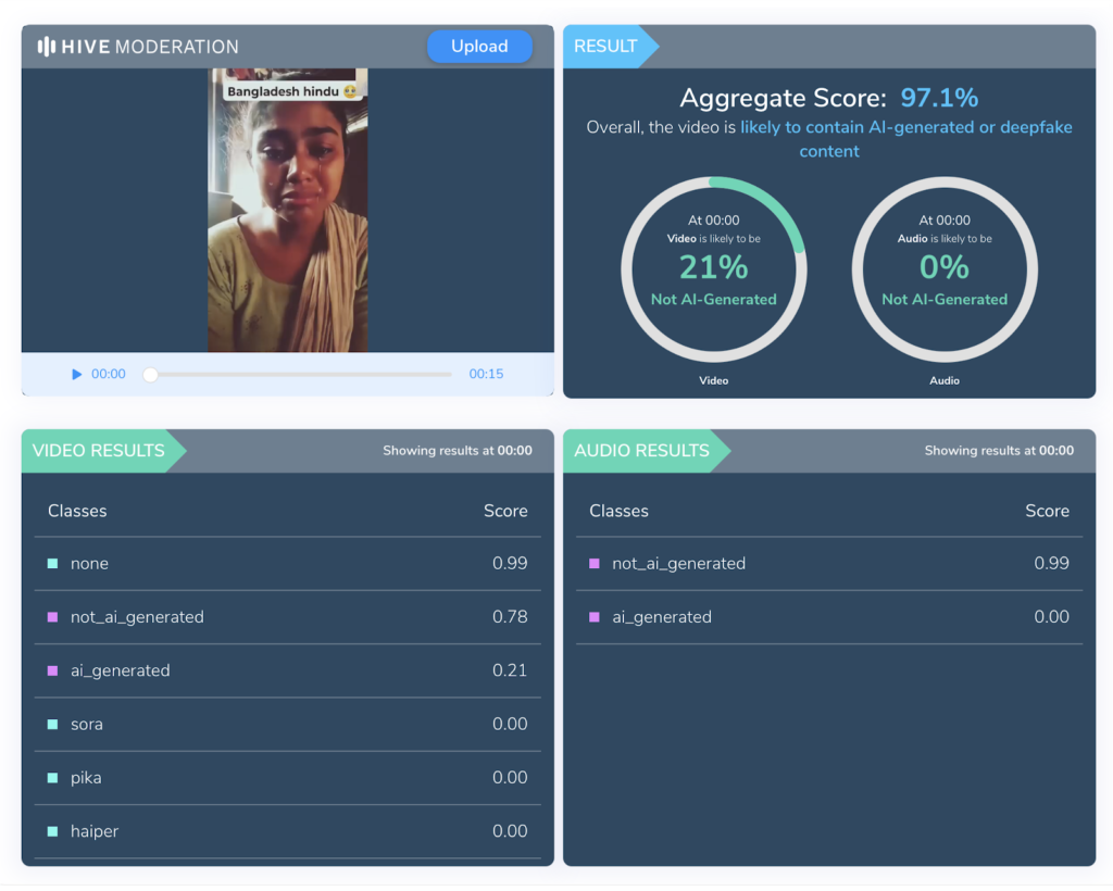 आगे जाँच में हमने हाइव मॉडरेशन पर इस वीडियो को जांचा ये पता लगाने के लिए कि क्या ये वीडियो AI के माध्यम से बनाया गया है या नहीं, ये टूल AI के माध्यम से बनाये गए तस्वीर, वीडियो या ऑडियो को डिटेक्ट करने में मदद करता है। टूल द्वारा जारी रिपोर्ट में स्पष्ट रूप से यह संकेत मिला कि यह वीडियो AI-जेनरेटेड है और किसी वास्तविक व्यक्ति या घटना को नहीं दर्शाता।