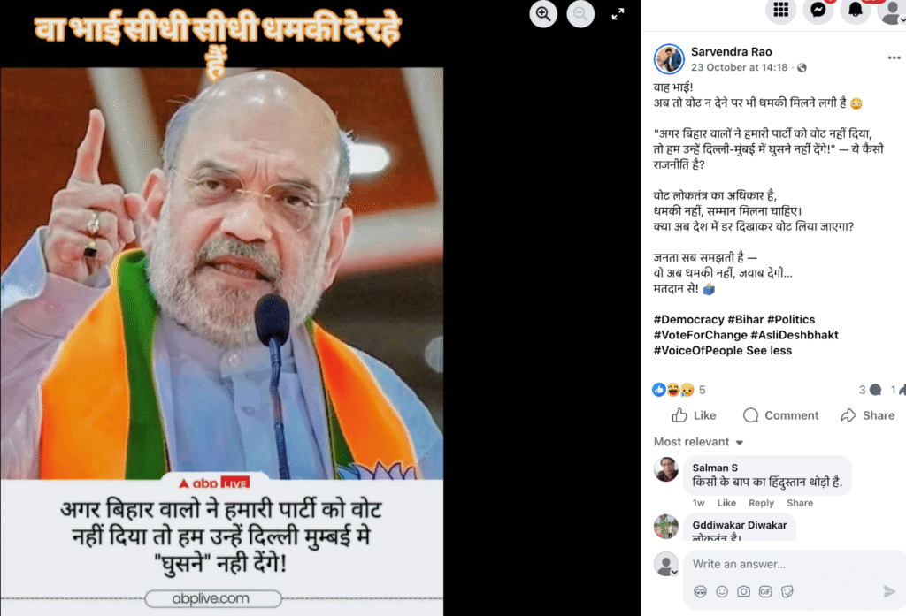 Title:क्या अमित शाह ने यह कहा कि “बिहारियों को दिल्ली-मुंबई में घुसने नहीं देंगे”? नहीं दावा फर्जी …