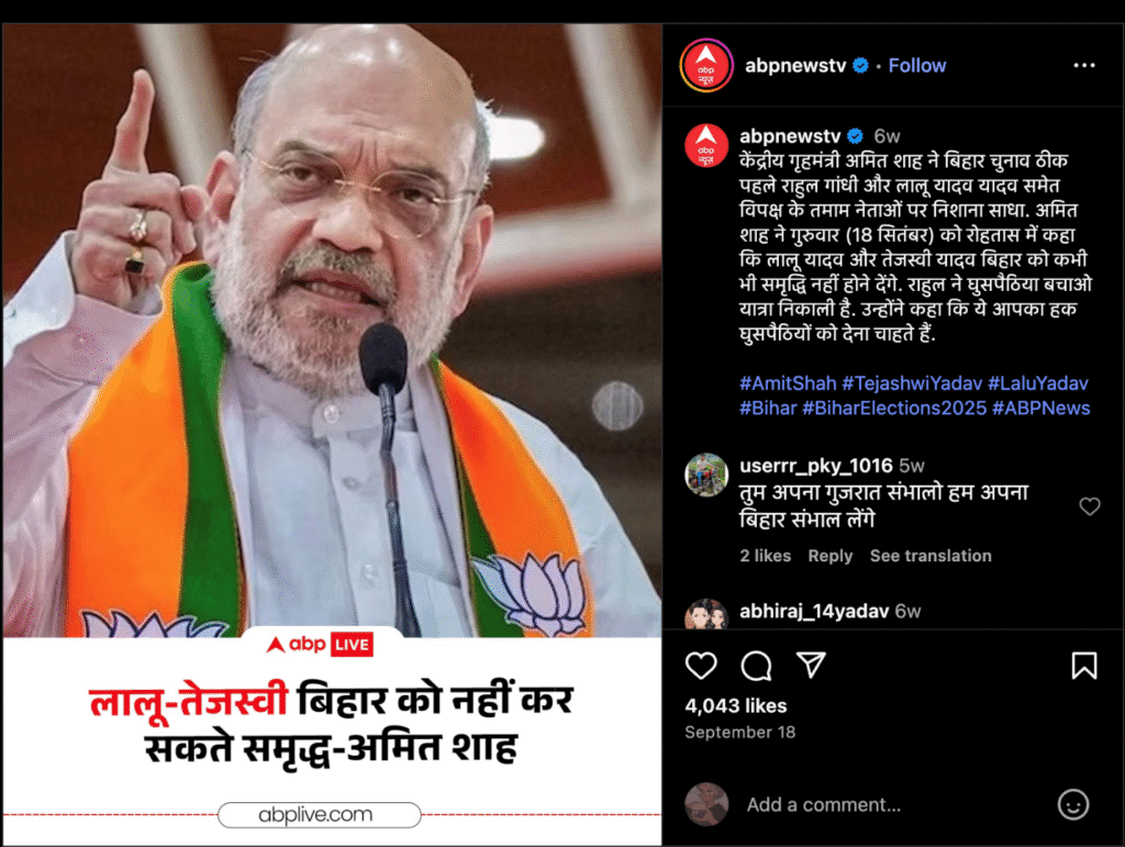 बिहार में विधानसभा के चुनाव दो चरणों में यानी 6 नवंबर और 11 नवंबर को होंगे। इसी बीच एबीपी न्यूज़ के नाम से एक कथित न्यूज़ ग्राफ़िक को सोशल मीडिया पर वायरल किया जा रहा है। वायरल ग्राफ़िक में दावा किया गया है कि भाजपा नेता और केंद्रीय गृह मंत्री अमित शाह ने बिहार के मतदाताओं को चेतावनी देते हुए कहा है कि, “अगर बिहार के लोग हमारी पार्टी को वोट नहीं देंगे, तो हम उन्हें दिल्ली और मुंबई में ‘घुसने’ नहीं देंगे!”