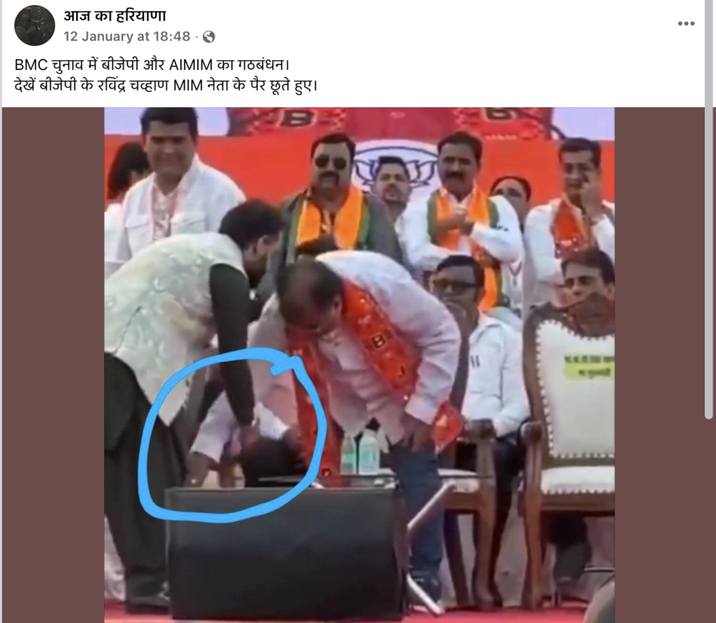 वायरल वीडियो के साथ यूजर ने लिखा है- BMC चुनाव में बीजेपी और AIMIM का गठबंधन। देखें बीजेपी के रविंद्र चव्हाण MIM नेता के पैर छूते हुए।