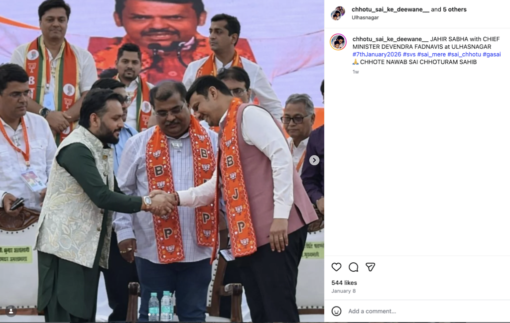 उनके अन्य एक इंस्टाग्राम पोस्ट पर हमें वायरल वीडियो के कुछ तस्वीर मिली। जिसके कैप्शन में लिखा है- उल्हासनगर में मुख्यमंत्री देवेन्द्र फड़नवीस के साथ जाहिर सभा ,7 जनवरी2026 ,svs, छोटे नवाब साईं छोटूराम साहब।