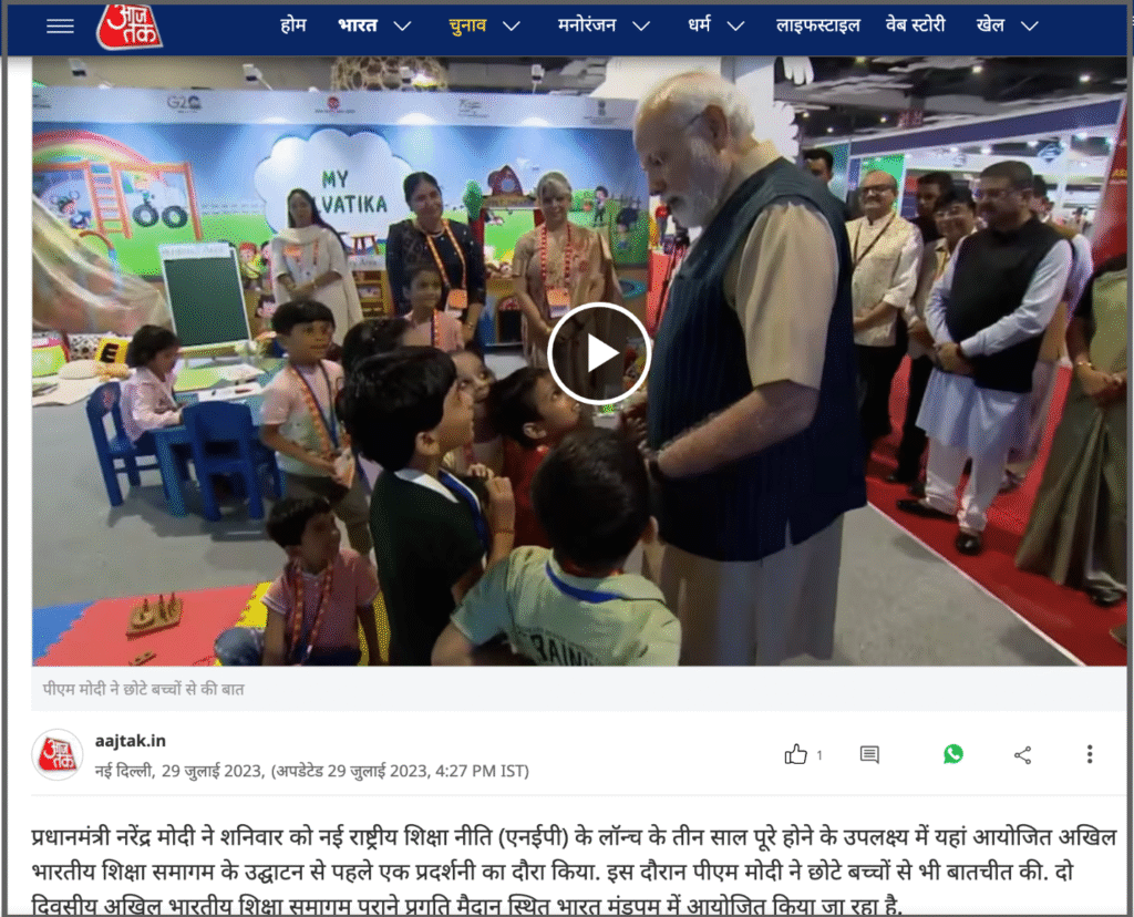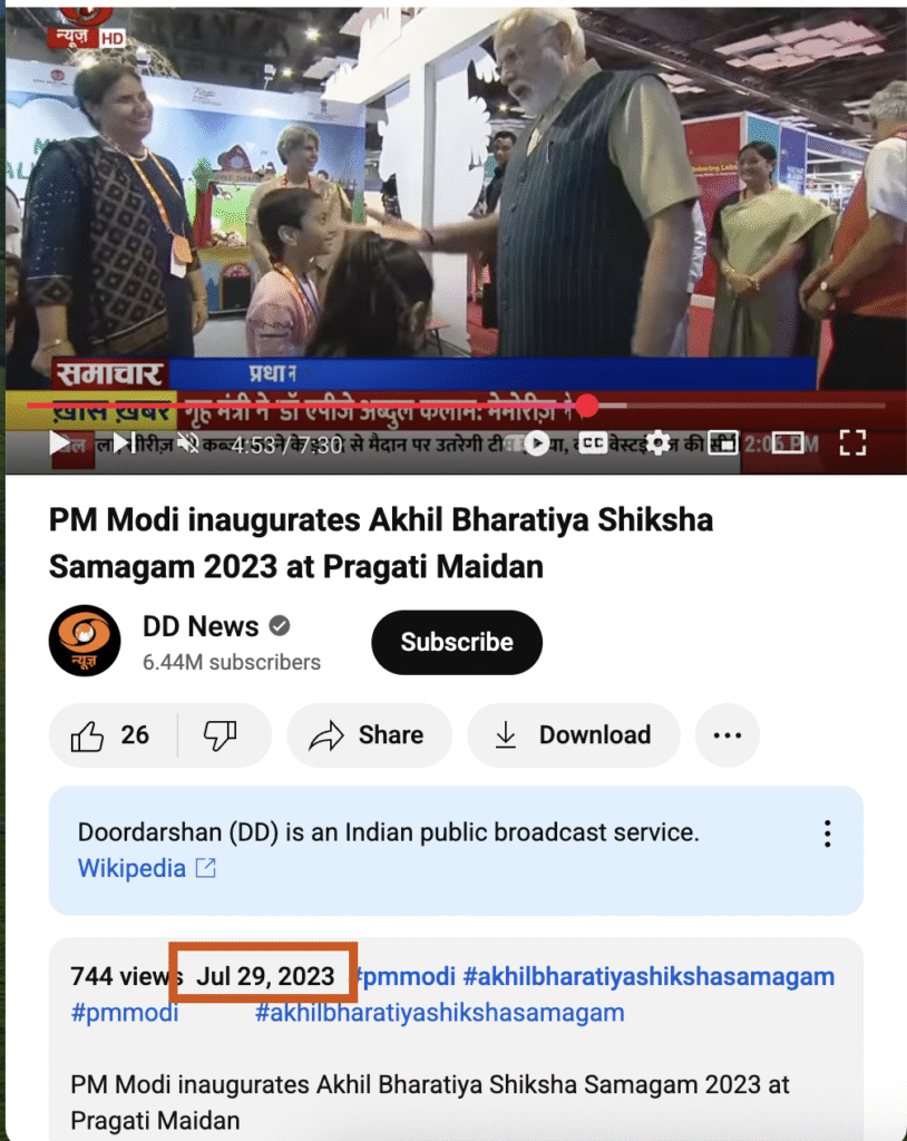 इसके अलावा आजतक की वेबसाइट पर भी 29 जुलाई 2023 को प्रकाशित एक रिपोर्ट में यह वीडियो मिला। रिपोर्ट में बताया गया है कि नई राष्ट्रीय शिक्षा नीति के तीन साल पूरे होने पर पीएम मोदी भारत मंडपम में आयोजित दो दिवसीय अखिल भारतीय शिक्षा समागम का उद्घाटन करने पहुंचे थे।