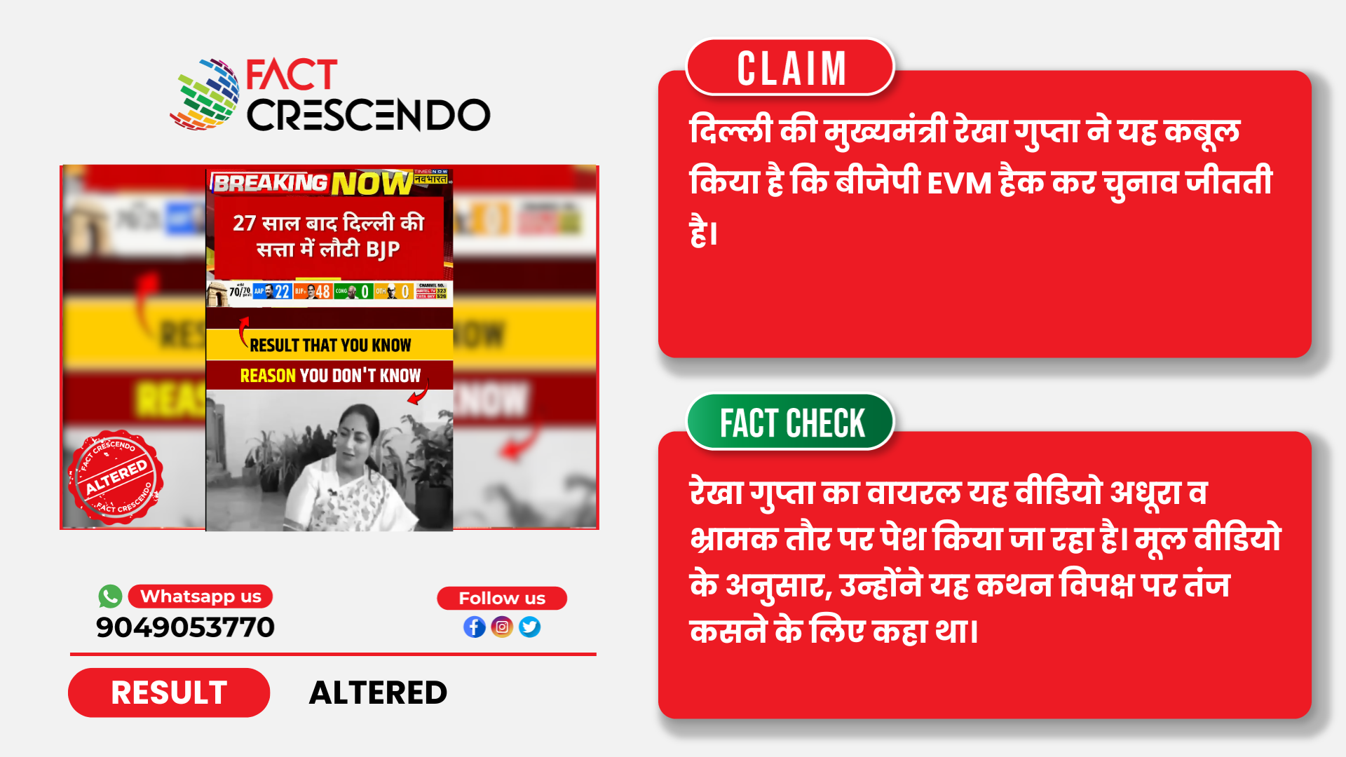 तथ्यों के जांच से यह पता चलता है कि EVM हैक पर रेखा गुप्ता का वायरल वीडियो अधूरा है। क्यूंकि मूल वीडियो से यह पुष्टि होती है कि, दिल्ली की मुख्यमंत्री रेखा गुप्ता असल में कांग्रेस पर व्यंग्यात्मक टिप्पणी कर रही थीं। और उनके उसी अधूरे वीडियो को भ्रामक दावों के साथ साझा किया जा रहा है।