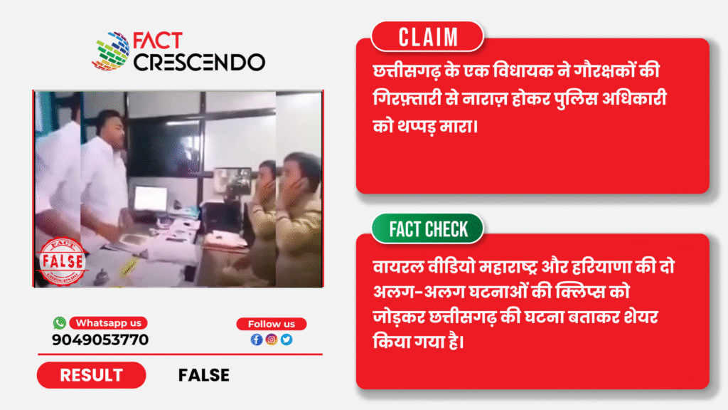 Title:क्या गौरक्षकों की गिरफ़्तारी से नाराज छत्तीसगढ़ के विधायक ने पुलिसकर्मी को थप्पड़ मारा? दो अलग-अलग क्लिप्स जोड़कर झूठे दावे से वायरल…