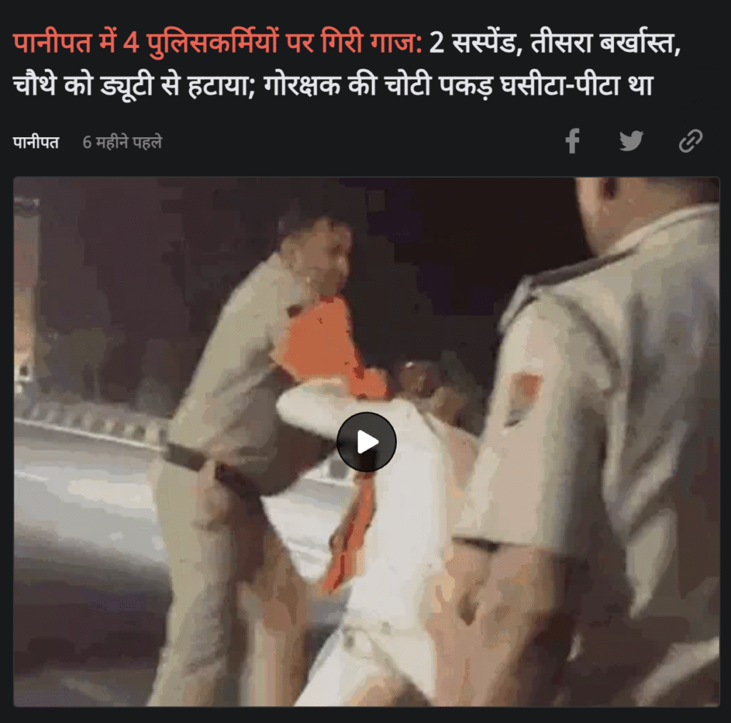 इसके अनुसार, यह घटना हरियाणा के पानीपत में पुलिस और गौरक्षकों के बीच झड़प के दौरान हुई थी। घसीटे जा रहे व्यक्ति का नाम करण है, जिसने आरोप लगाया कि उसने पुलिस को गौ तस्करों के दो वाहनों को जब्त करने में मदद की थी, लेकिन पुलिस ने उन्हें बिना कार्रवाई के छोड़ दिया। जब उसने विरोध किया, तो उसके साथ दुर्व्यवहार किया गया और मारपीट की गई।