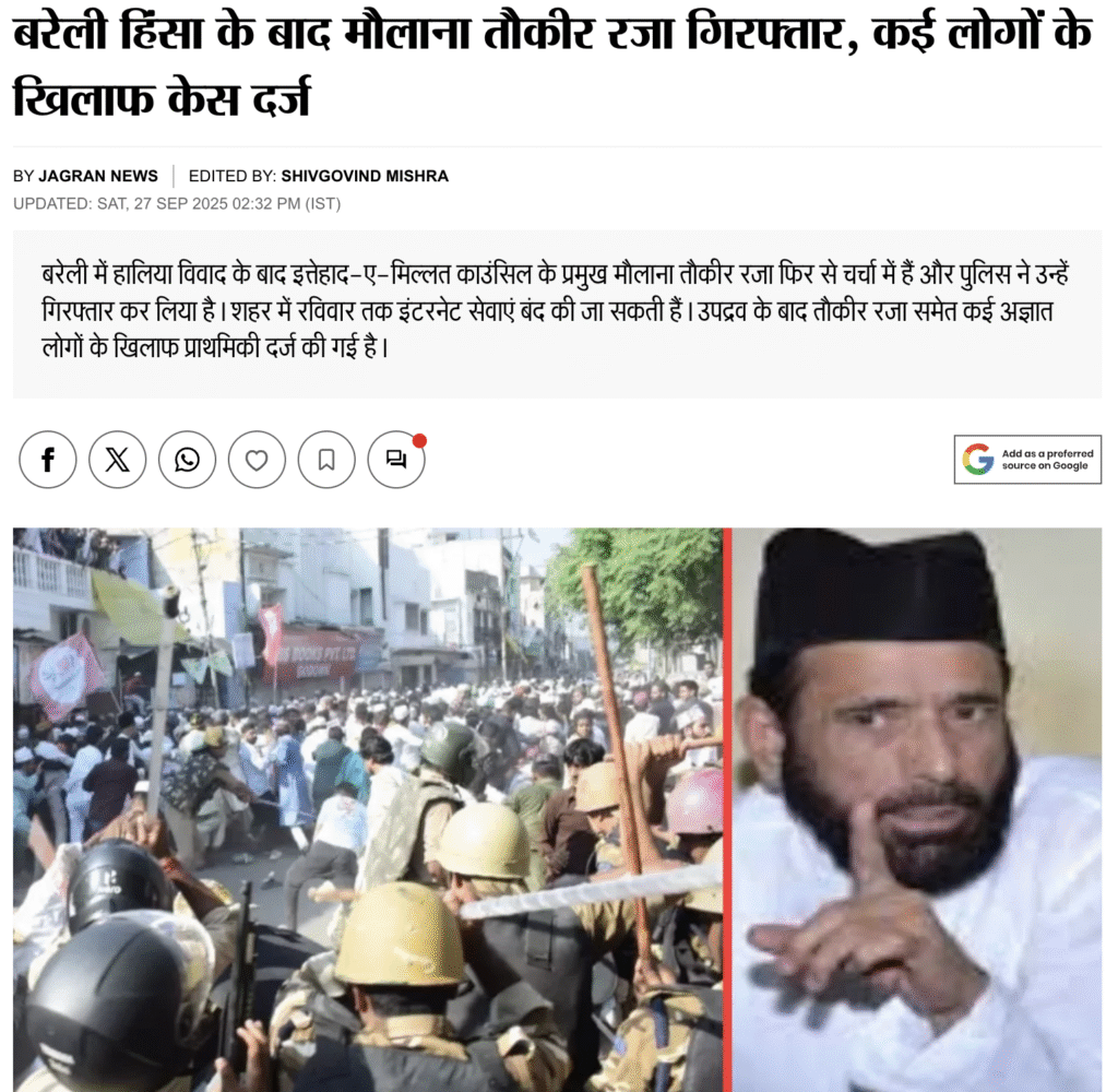 दैनिक जागरण  की 27 सितम्बर की खबर के अनुसार, “बरेली में हालिया विवाद के बाद इत्तेहाद-ए-मिल्लत काउंसिल (आईएमसी) के प्रमुख मौलाना तौकीर रजा फिर से सुर्खियों में हैं। तौकीर रजा को पुलिस ने गिरफ्तार कर लिया है और शहर की इंटरनेट सेवाएं बंद हैं।”