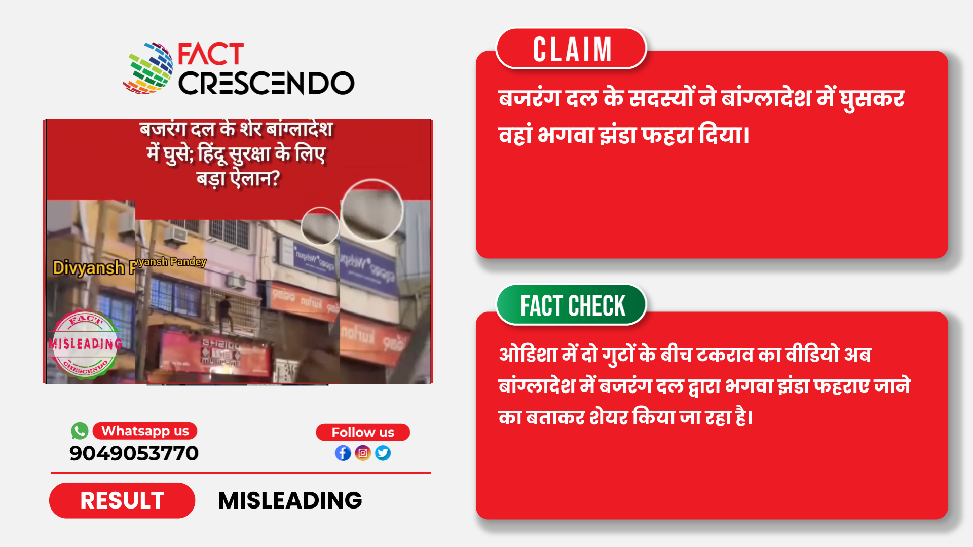 निष्कर्ष- तथ्य-जांच के बाद, हमने पाया कि, ओडिशा में दो गुटों के बीच टकराव का वीडियो को बांग्लादेश में बजरंग दल द्वारा भगवा झंडा फहराए जाने का बताकर शेयर किया जा रहा है।