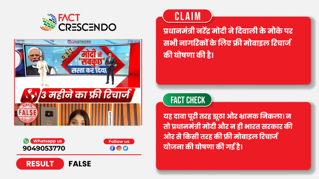 फैक्ट क्रेसेंडो की जांच में यह दावा पूरी तरह झूठा और भ्रामक निकला। न तो प्रधानमंत्री मोदी और न ही भारत सरकार की ओर से किसी तरह की फ्री मोबाइल रिचार्ज योजना की घोषणा की गई है।